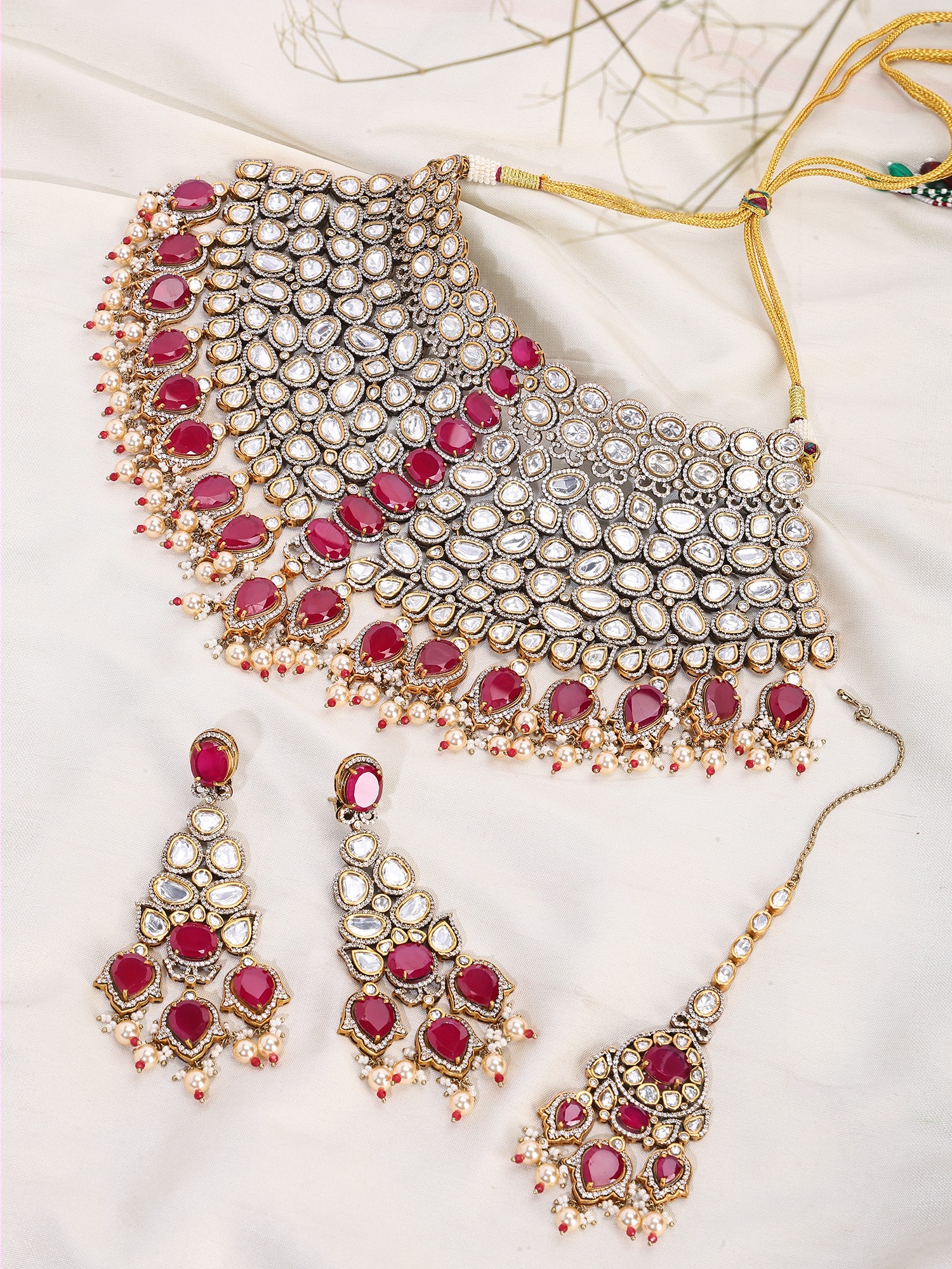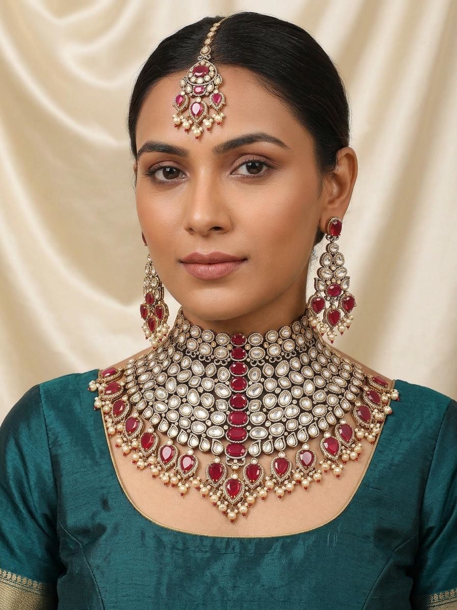 Kundan Bridal Choker Necklace Set with Pearl Drops, Earrings & Maang Tikka