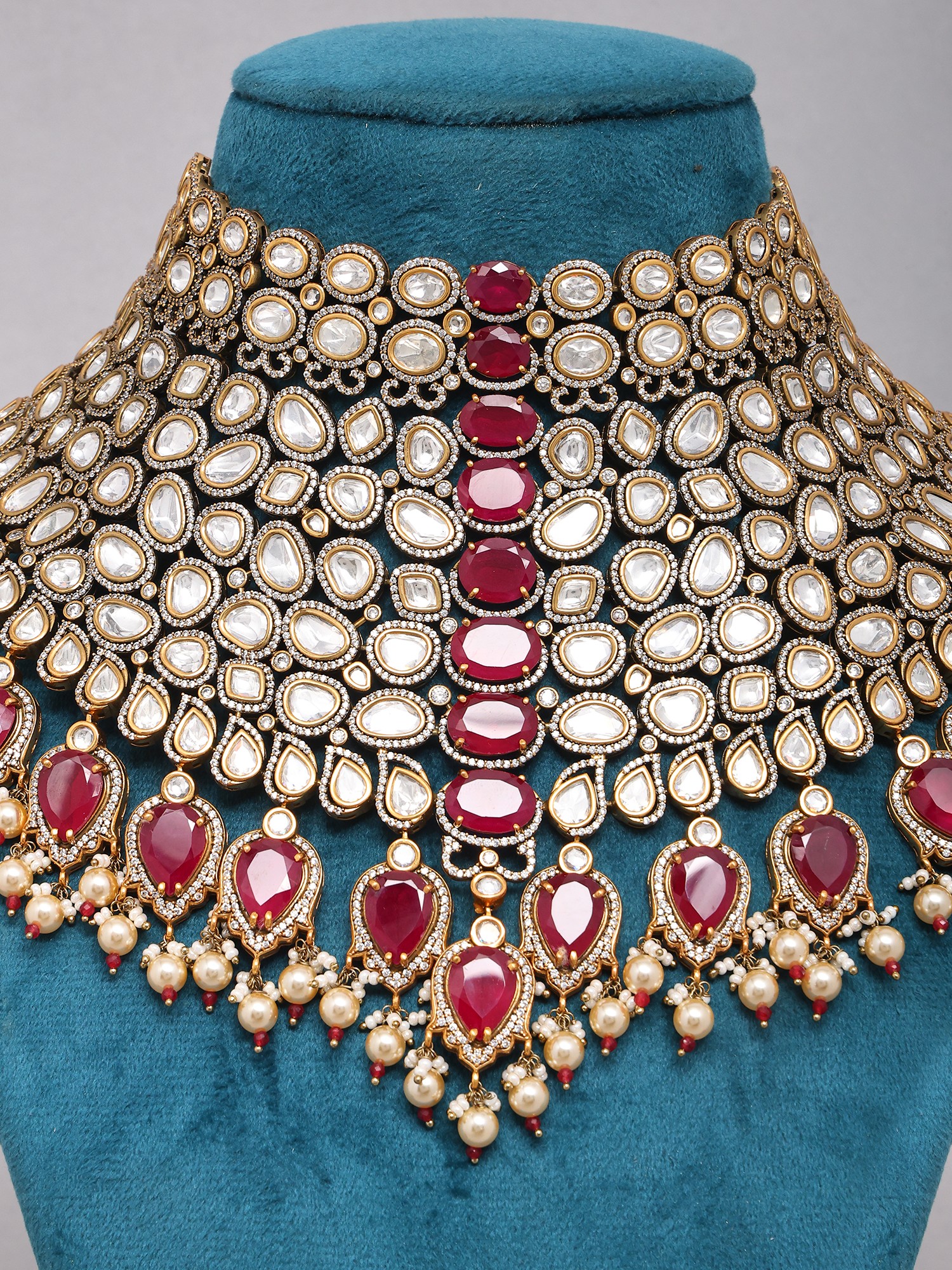 Features a striking choker necklace design adorned with vibrant red teardrop-shaped stones.