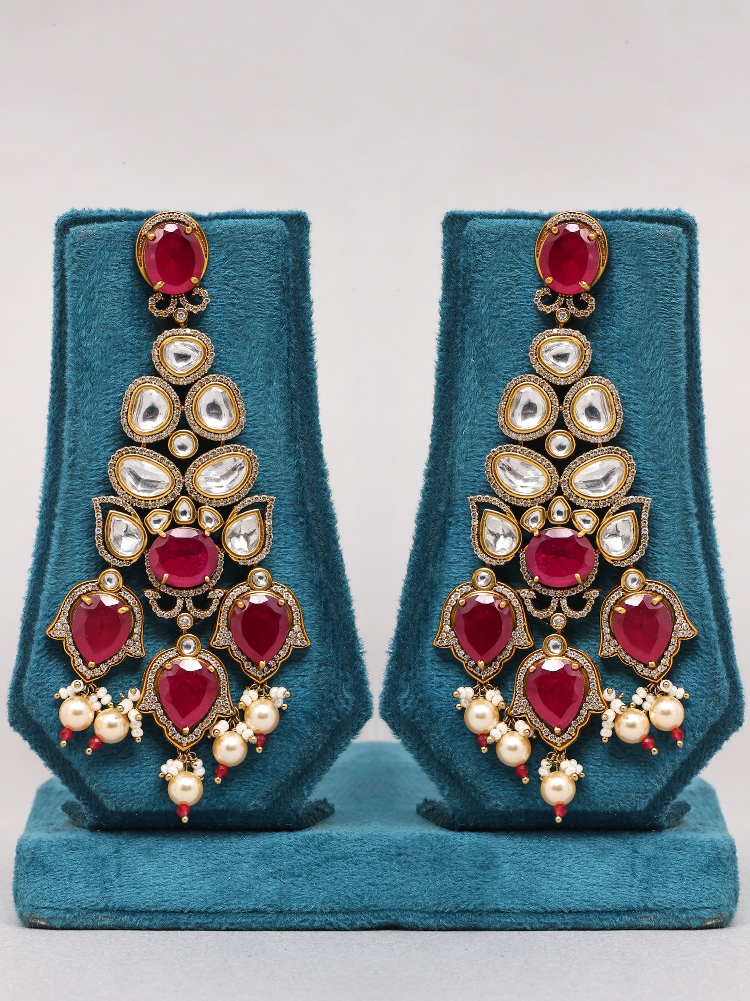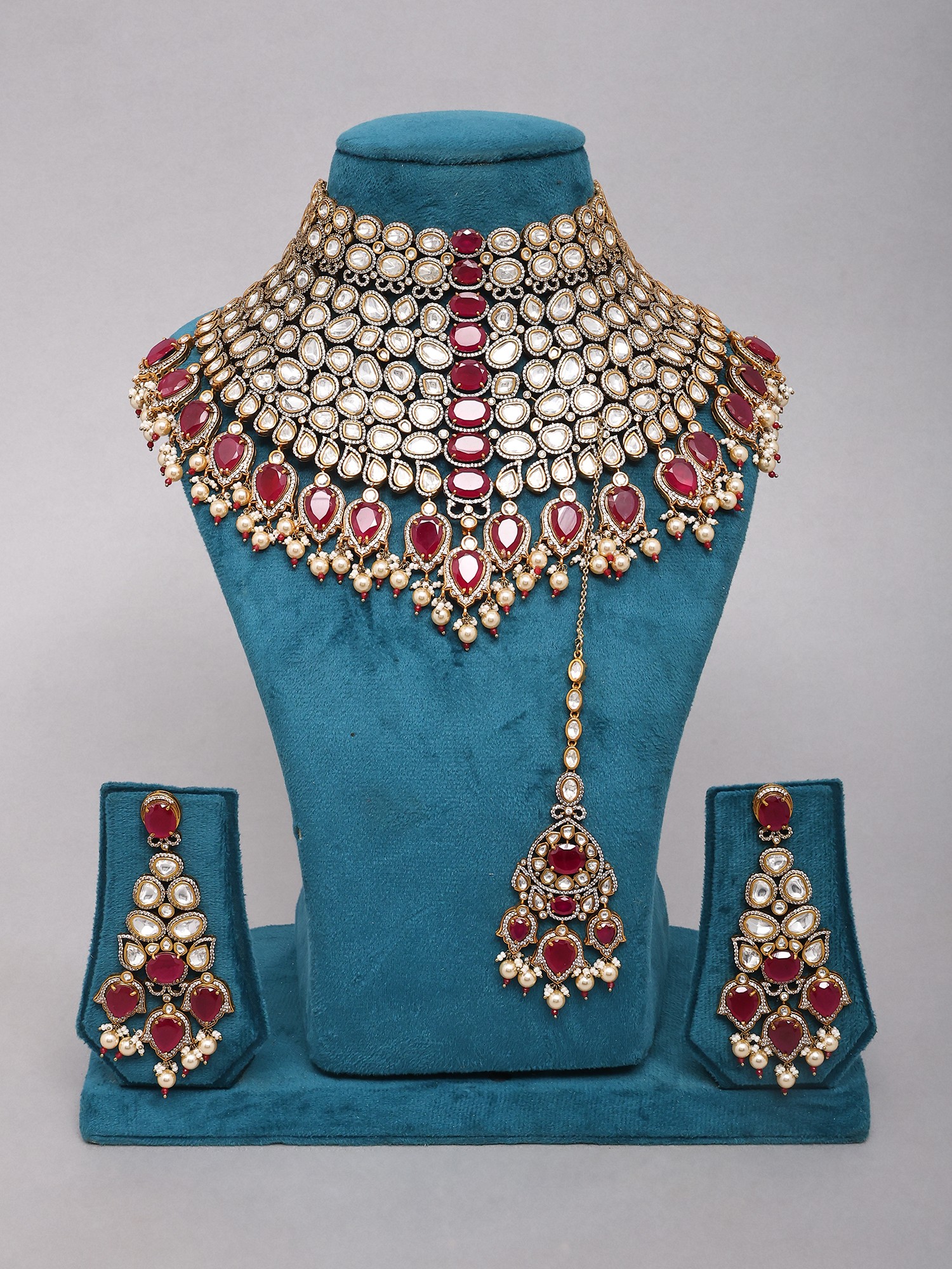 Embellished with clear Kundan stones and smaller pearl accents for added sparkle.