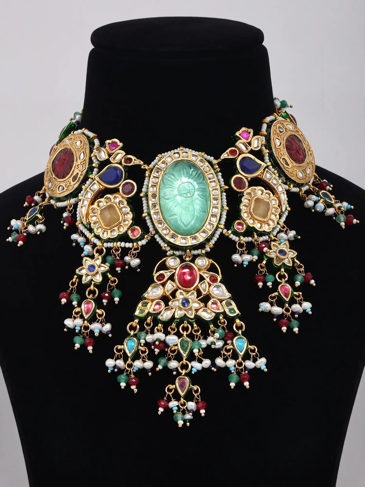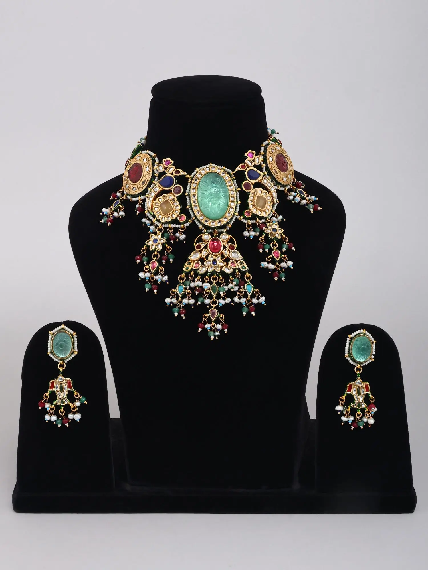 Multi-Color Navratna Kundan Stone Studded Layered Choker Necklace Set with Earrings