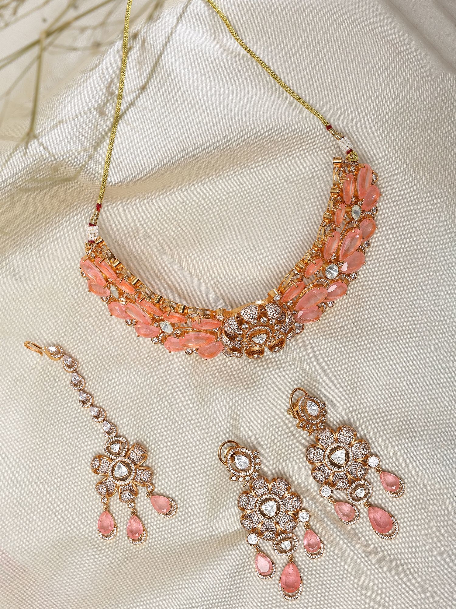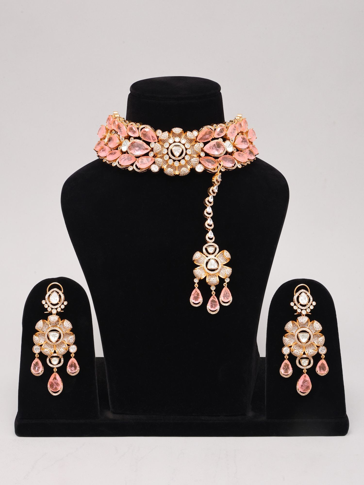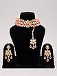 Complete set includes a statement necklace, elegant earrings, and a matching maang tikka.