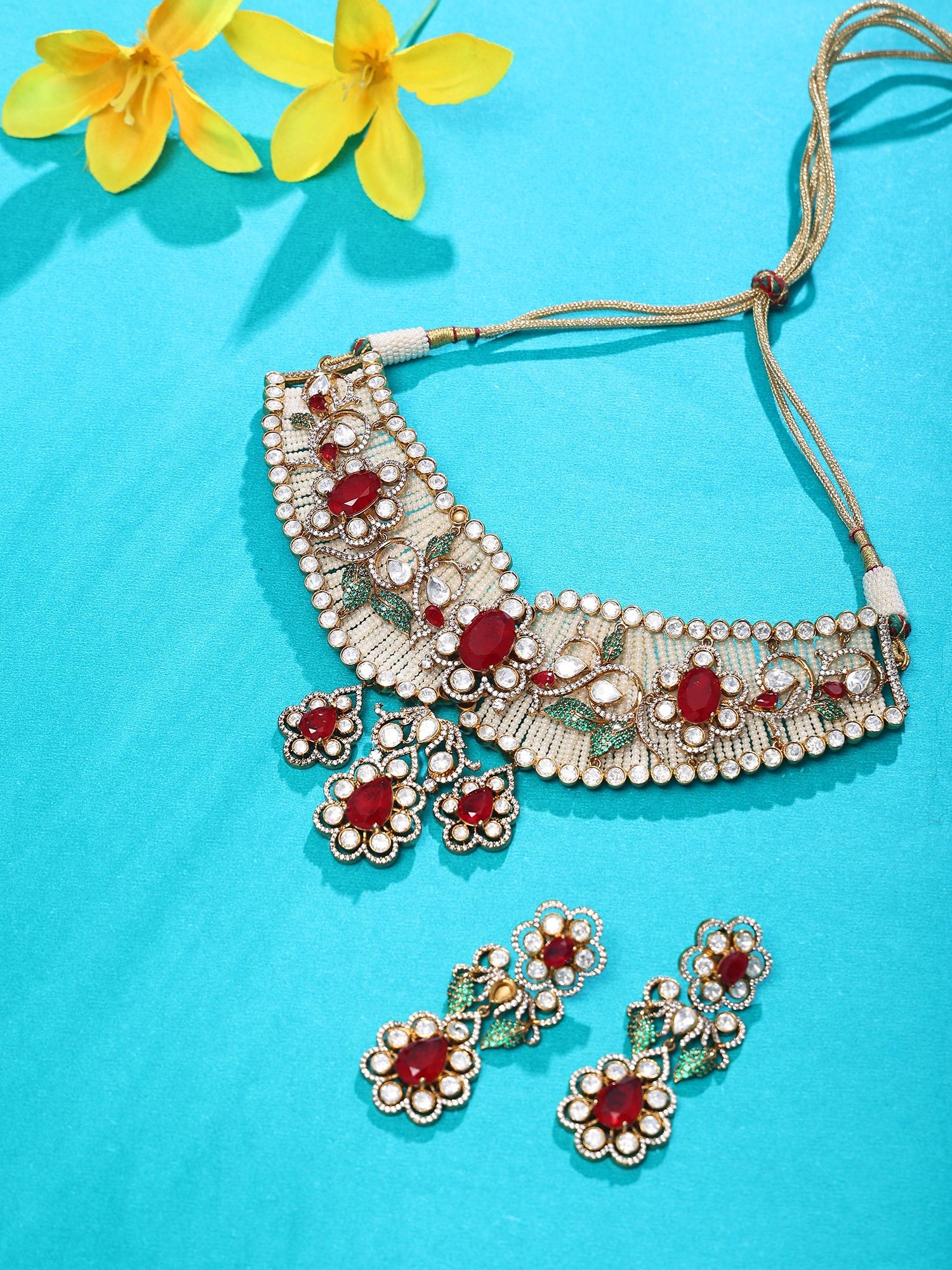 Choker with Adjustable Dori- L- 3.5 Inch x W-5.5 Inch | Earrings L-2.7 Inch x W- 1 Inch