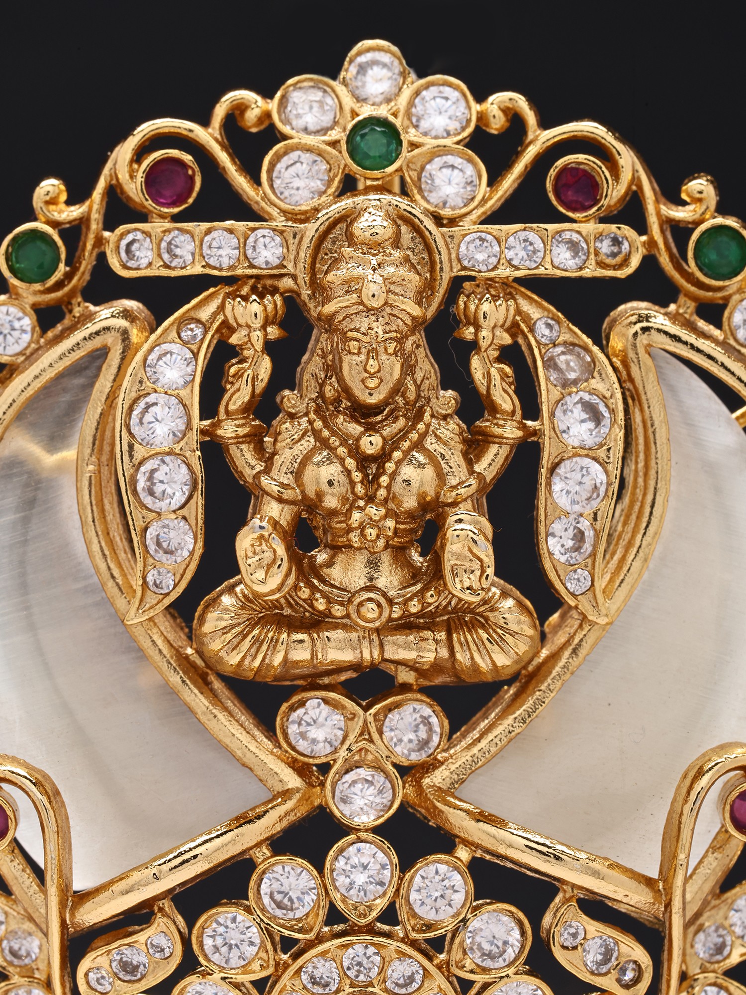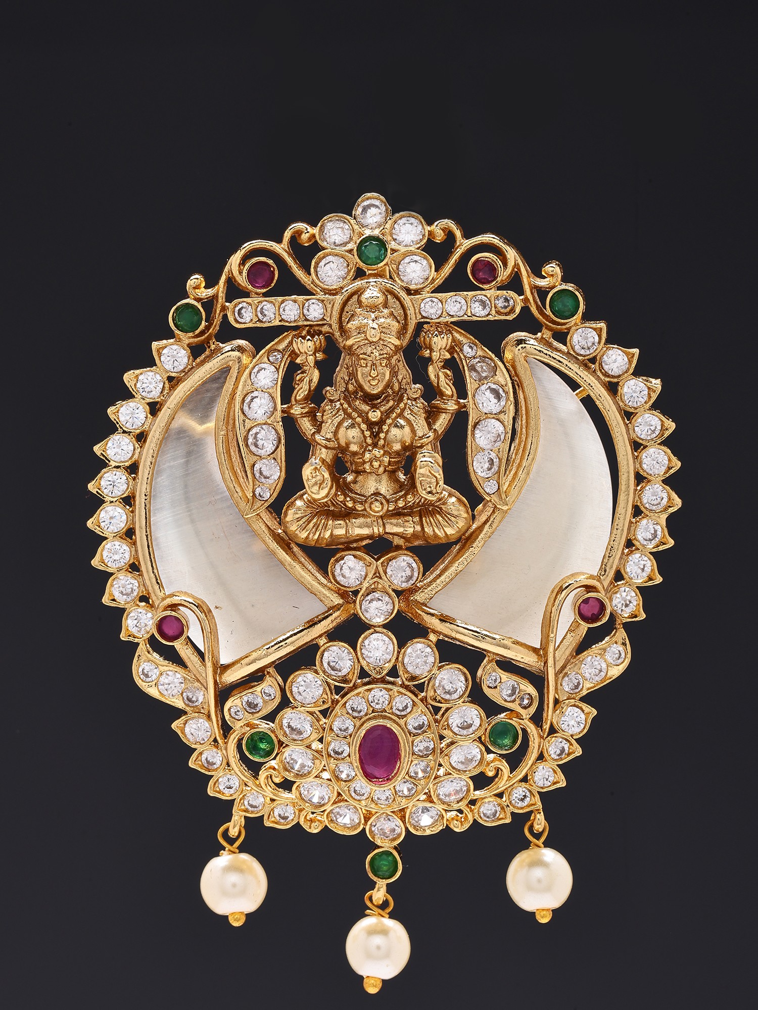 Adorned with a symphony of sparkling Kundan stones, vibrant green emeralds, and deep red rubies, this piece radiates an ethereal glow. These precious accents are artfully arranged around a central mother-of-pearl inlay, providing a luminous backdrop for the golden deity. Delicate pearls suspend from the lower edge, adding a graceful fluidity and completing the opulent aesthetic. Measuring 3.1 inches in height and 2.15 inches in width, its dimensions are perfectly proportioned for a striking yet elegant presence.