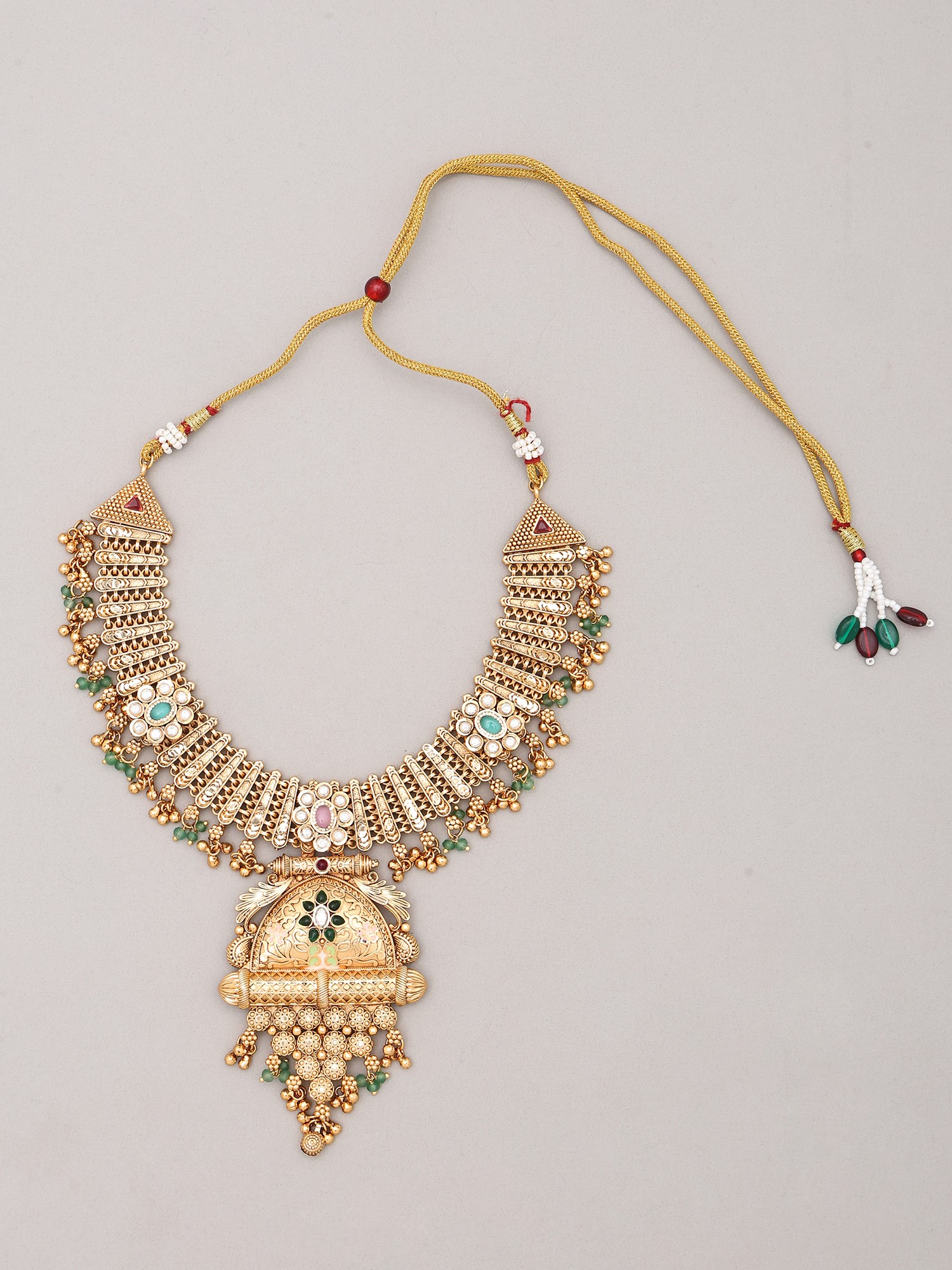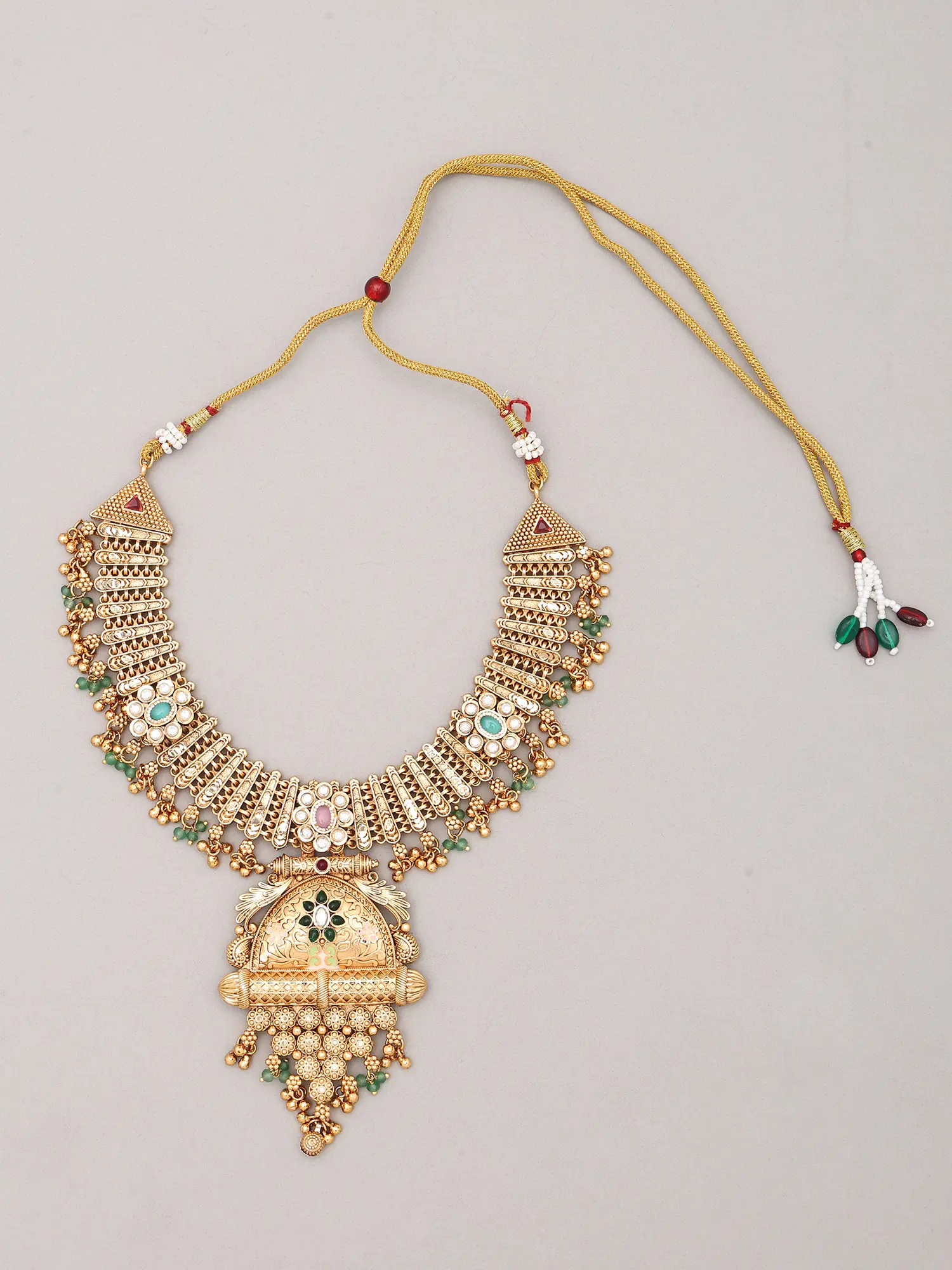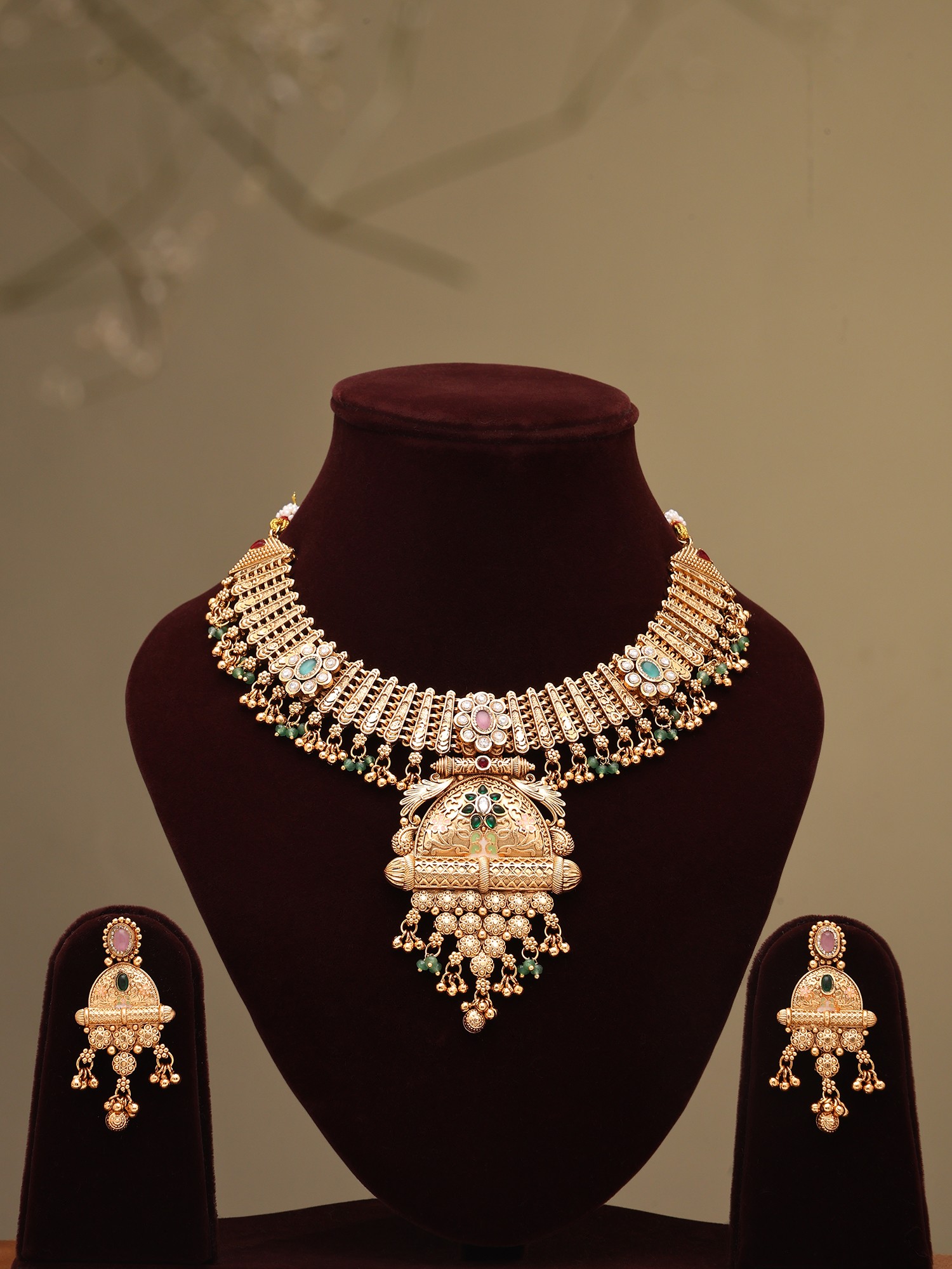 The necklace, with its commanding 6.95-inch height, presents a breathtaking centerpiece featuring a domed pendant adorned with vibrant Kundan stones and intricate filigree work. Delicate ghungroo drops cascade from the pendant and along the intricately textured collar, promising a subtle, melodious chime with every movement. Complementing this masterpiece, the earrings, each measuring 2.10 inches in height and 0.95 inches in width, echo the necklace's ornate design, featuring similar intricate patterns and dangling ghungroos that add a touch of playful sophistication to your look.