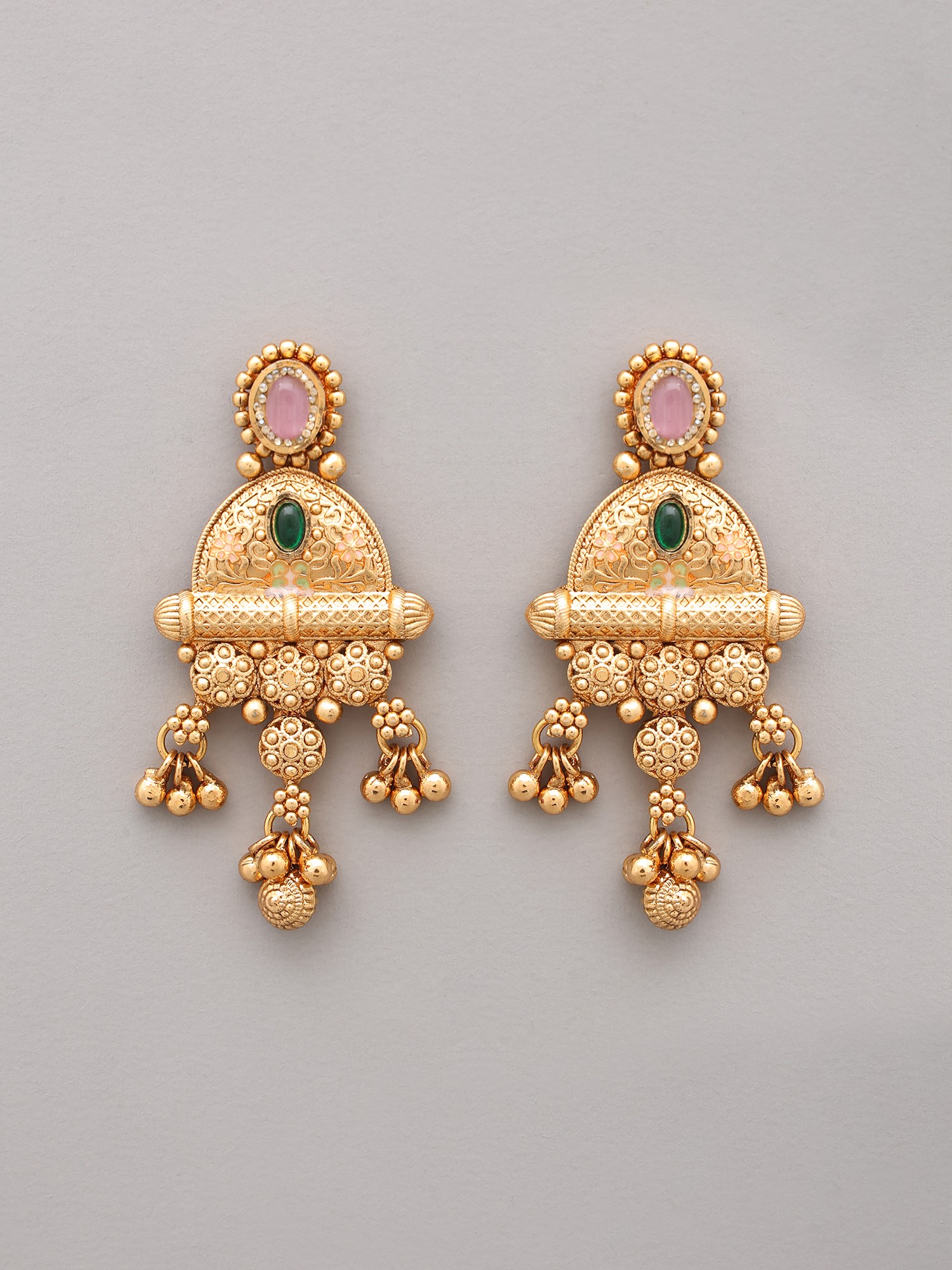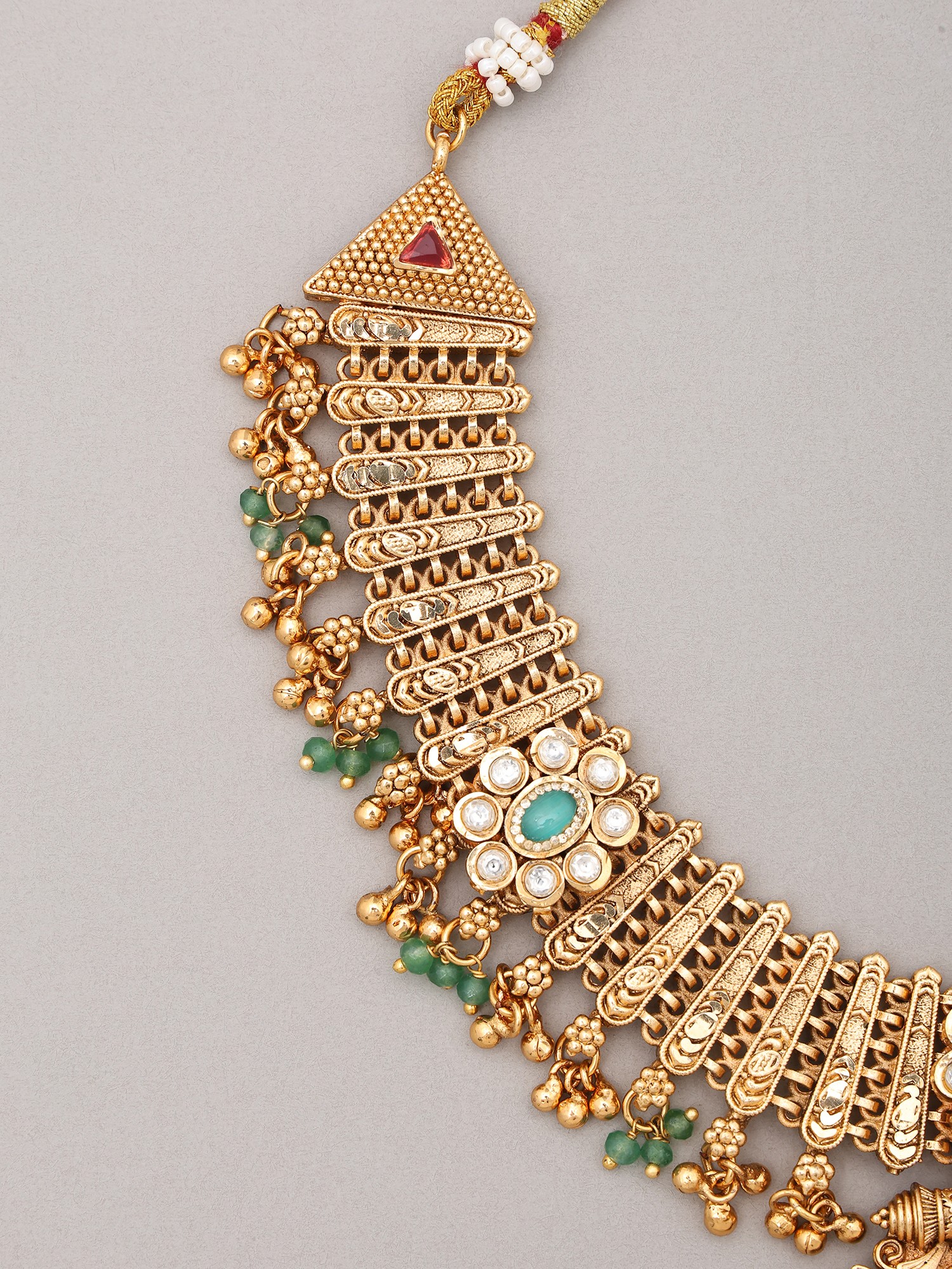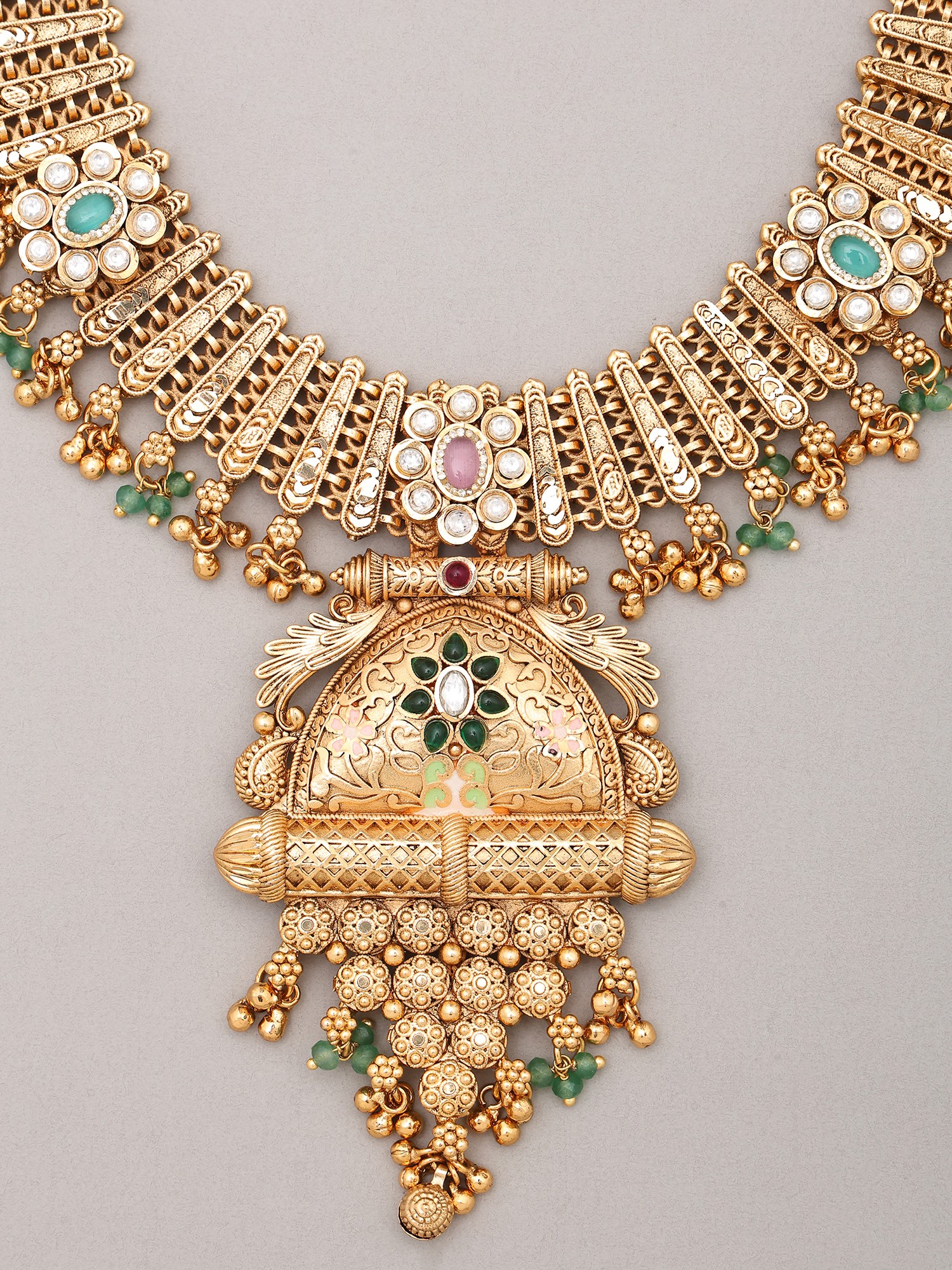 The necklace, with its commanding 6.95-inch height, presents a breathtaking centerpiece featuring a domed pendant adorned with vibrant Kundan stones and intricate filigree work. Delicate ghungroo drops cascade from the pendant and along the intricately textured collar, promising a subtle, melodious chime with every movement. Complementing this masterpiece, the earrings, each measuring 2.10 inches in height and 0.95 inches in width, echo the necklace's ornate design, featuring similar intricate patterns and dangling ghungroos that add a touch of playful sophistication to your look.