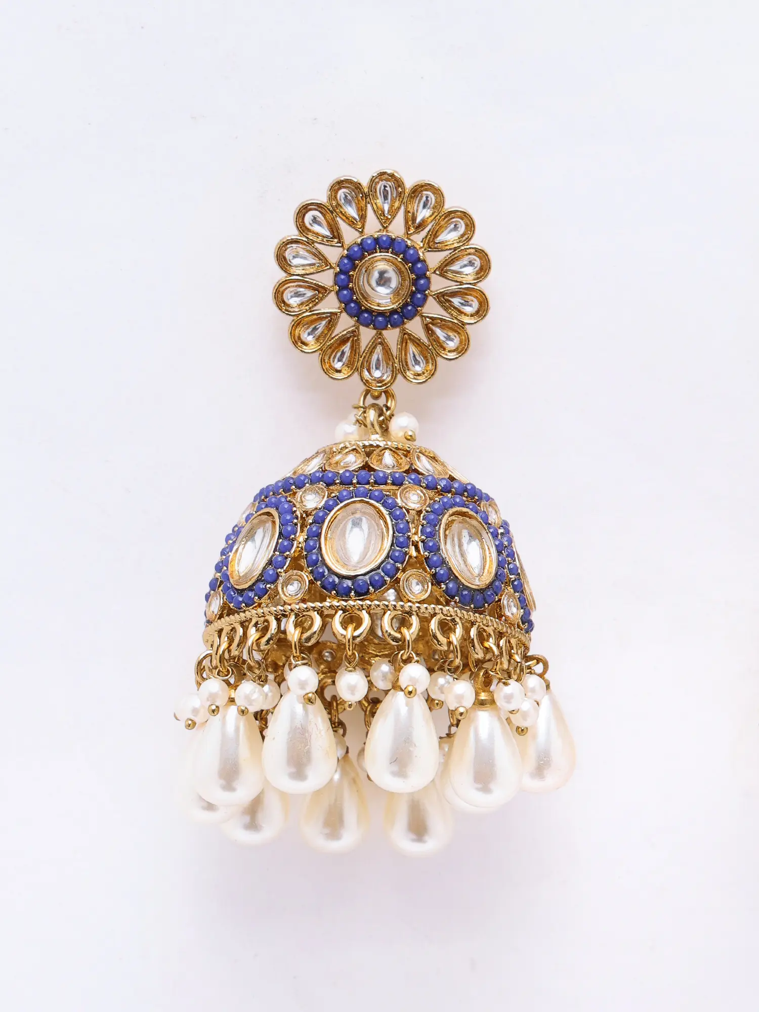 The jhumkas are designed in a classic jhumka style, with a beautifully detailed floral top and a cascading row of pearls. The jhumka's bell-shaped design creates a mesmerizing sway with every movement, adding a touch of grace and charm to your overall appearance. The intricate kundan work, characterized by its delicate setting of precious stones, is executed with flawless precision, showcasing the artistry and expertise of skilled artisans. The deep blue stones are set against the gold, creating a captivating contrast that draws the eye and adds depth to the design. The pearls add a touch of subtle elegance, creating a balanced and sophisticated look. The mangtika, or maang tikka, is similarly adorned with kundan work and pearls, creating a stunning headpiece that will enhance your hairstyle and overall look.