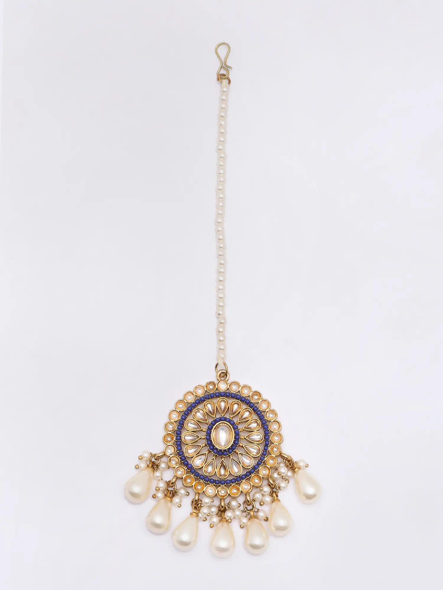 Crafted from high-quality brass, this set is designed for lasting beauty. The durable brass base provides a sturdy foundation for the intricate kundan work and pearl embellishments, ensuring that the set will remain in excellent condition with proper care. The lustrous finish of the brass adds a touch of luxury to the design, making it a true statement piece that will elevate any outfit. The pearls are carefully selected for their size, shape, and luminosity, ensuring a consistent and eye-catching effect. The deep blue stones are vibrant and richly hued, creating a look that is both classic and contemporary. This set is not only beautiful but also built to last.