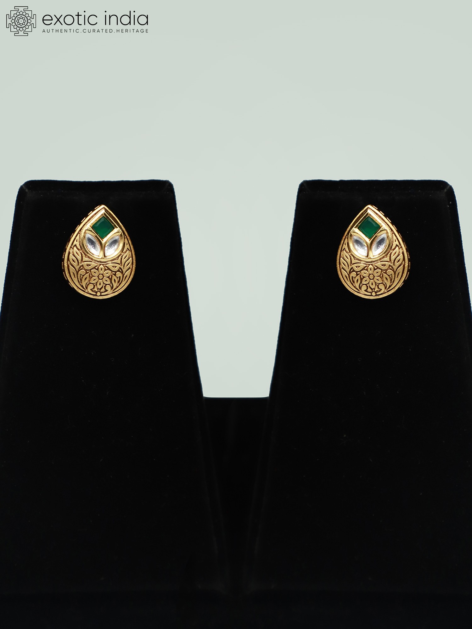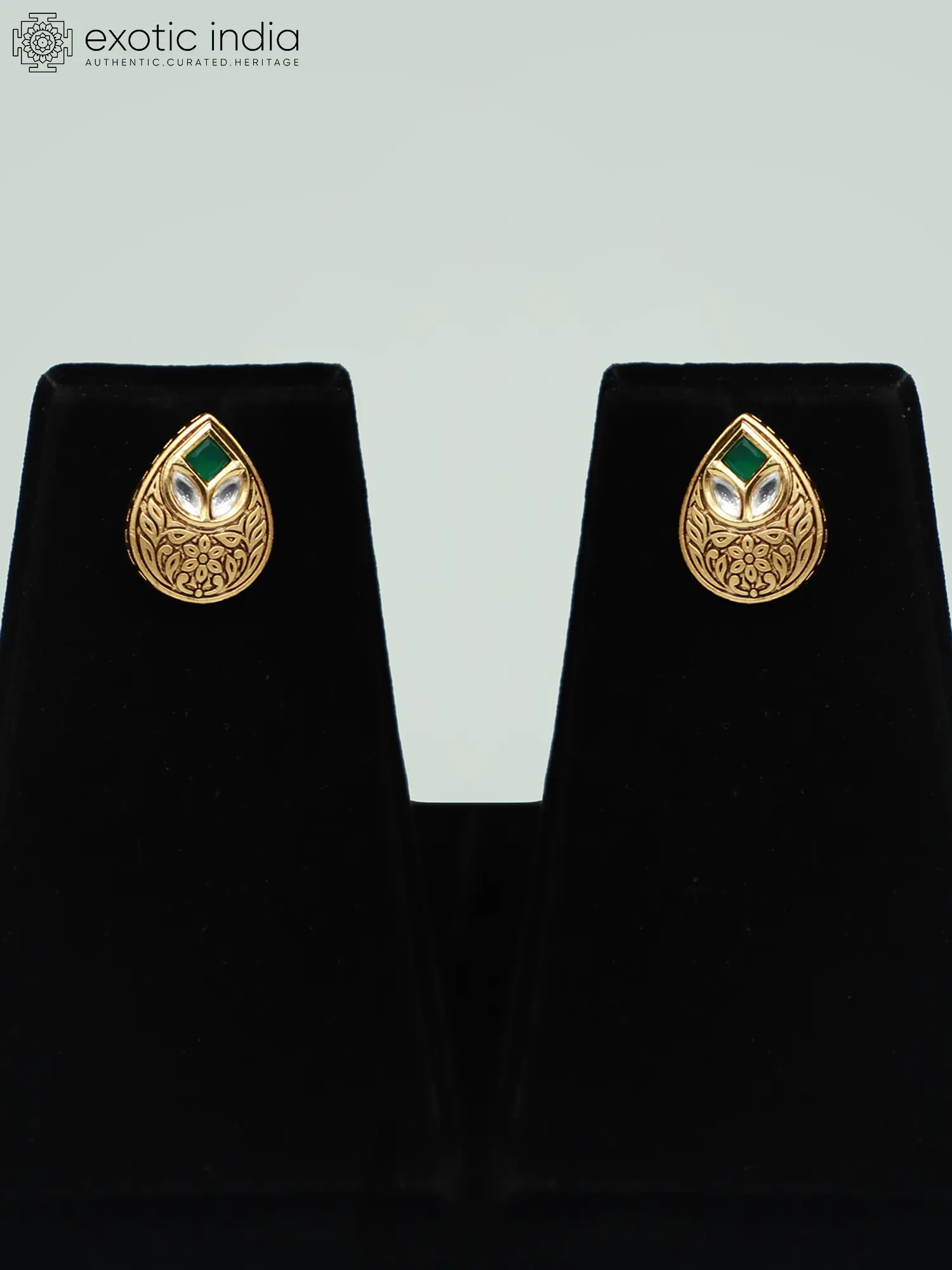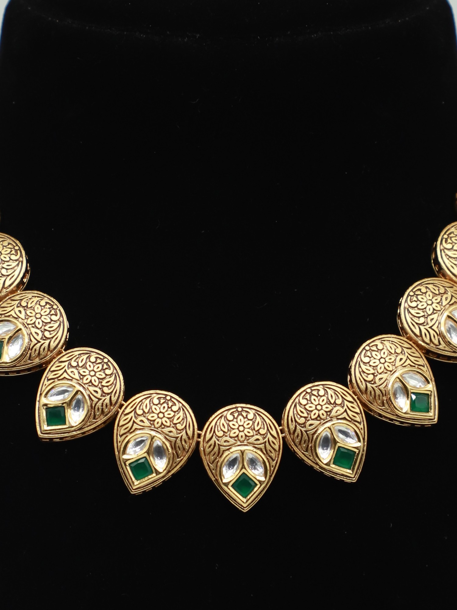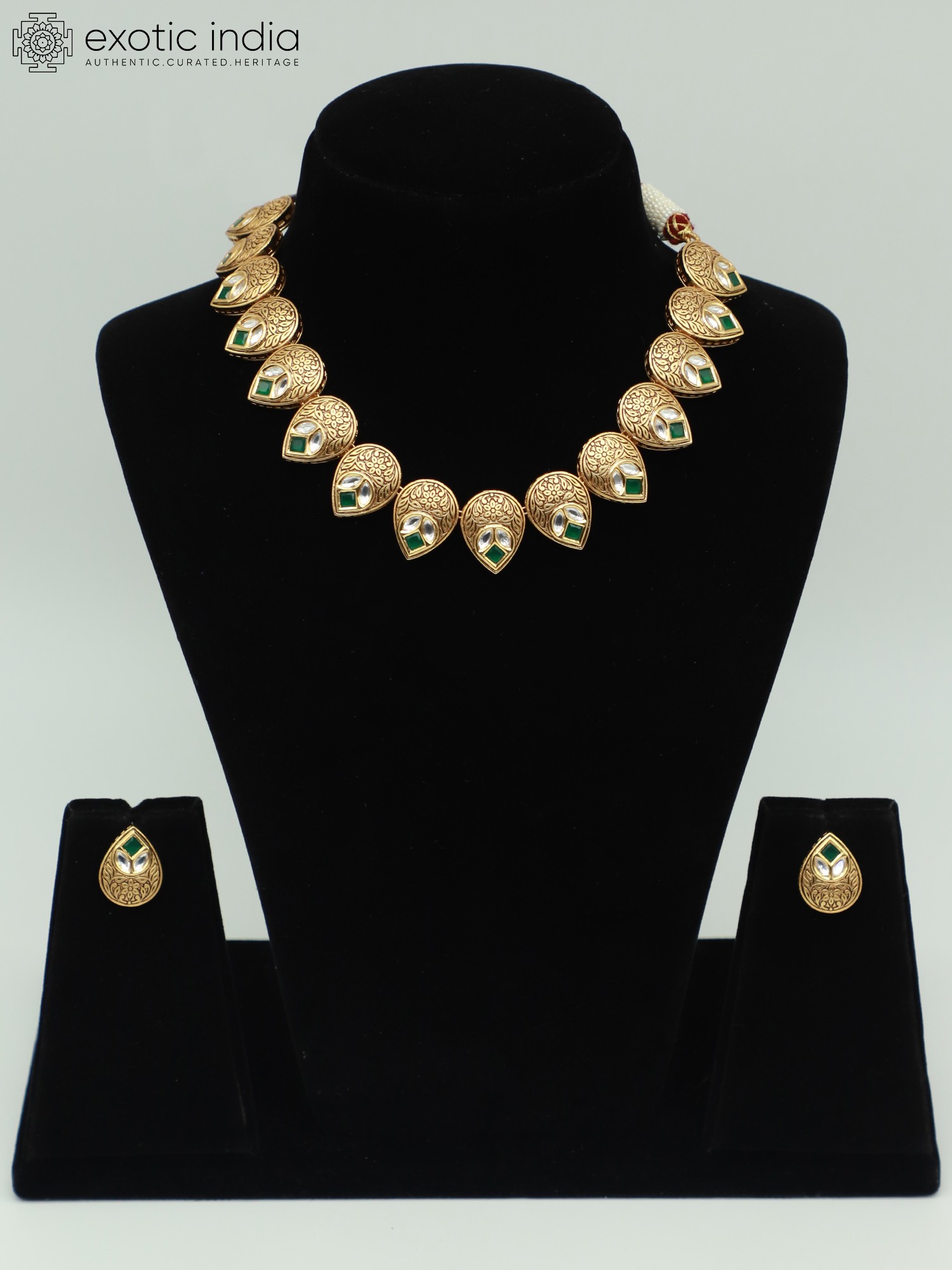 The necklace features a series of meticulously crafted brass pendants, each adorned with intricate carvings. The floral motifs and traditional patterns showcase the skill and artistry involved in creating this exquisite piece. The Kundan stones, carefully embedded within the pendants, catch the light beautifully, adding a touch of sparkle and glamour. The classic teardrop shape of both the necklace pendants and earrings further enhances the graceful and feminine appeal of the set.