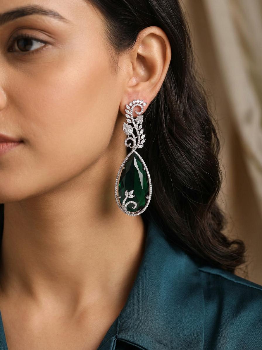 The design features a striking, teardrop-shaped gemstone in a deep, captivating green, reminiscent of the most precious emeralds. Encircling this central jewel and forming the ornate top is a cascade of micro-set American diamonds, each catching the light with remarkable intensity. The overall length, approximately three inches, provides a graceful sweep, while the width of just under an inch ensures a statement without overwhelming. The interplay of the brilliant white diamonds against the rich green stone creates a visually arresting composition that draws the eye and commands attention.