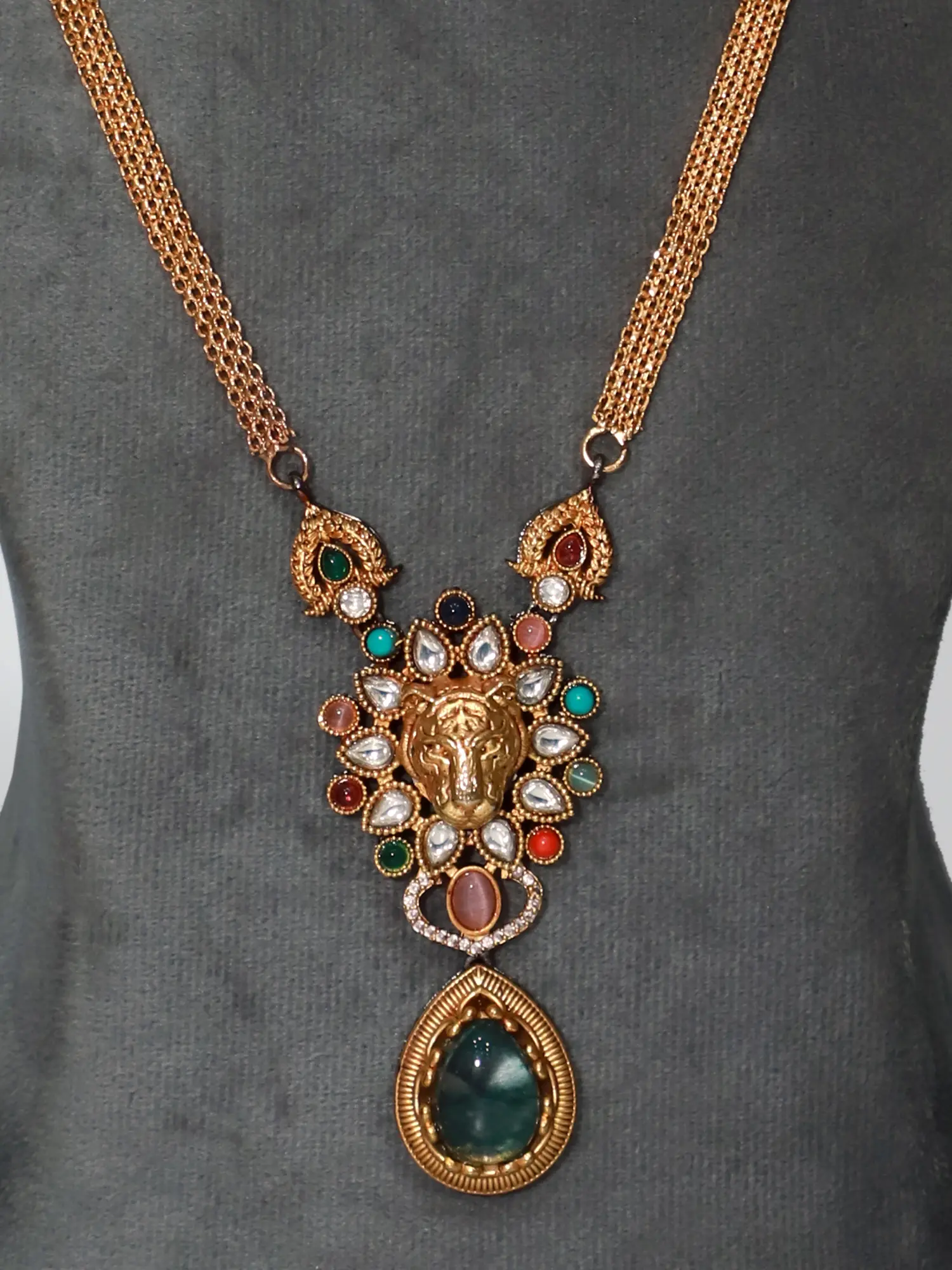 Each component of this jewelry set is a testament to the artistry of skilled artisans. The centerpiece, a stunning lion face pendant, is encircled by a vibrant halo of multi-colored stones, creating a captivating contrast against the brass. These stones, carefully selected for their brilliance and quality, add depth and luminosity to the design. The attention to detail is remarkable, from the finely etched features of the lion to the precise setting of each gemstone. The earrings mirror the necklace’s design, featuring matching lion face accents and a similar vibrant stone setting. The delicate chain of the necklace gracefully complements the bolder design elements, resulting in a perfectly balanced piece of jewelry.
