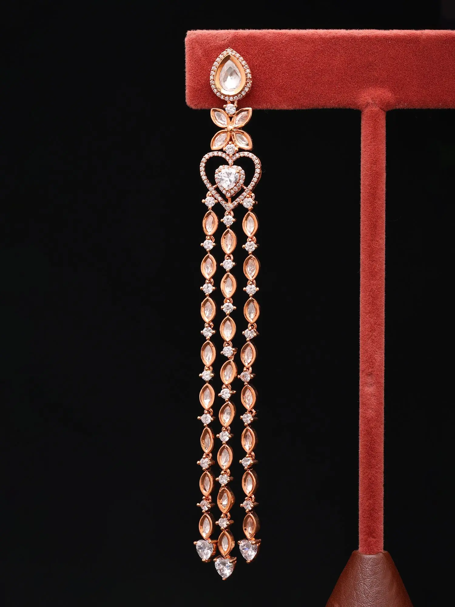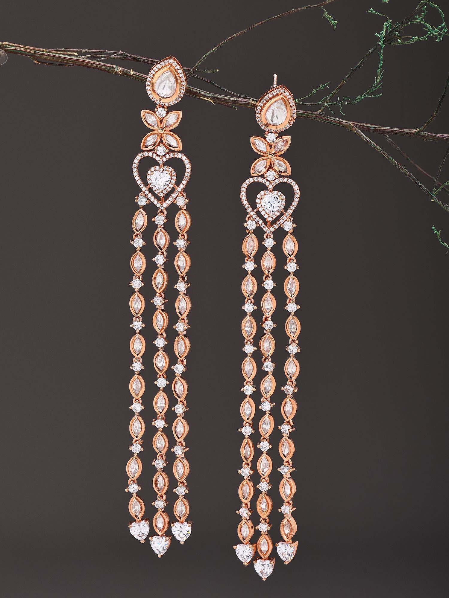 Prepare to be captivated by the design, which measures approximately 6 inches in length and 0.6 inches in width. A pear-shaped zircon forms the apex, leading to a delicate floral motif that transitions into a heart-shaped outline, brimming with smaller, brilliant zircon accents. Cascading from this central piece are three independent strands, each adorned with alternating marquise and round-cut zircons, culminating in charming heart-shaped terminations. The interplay of different cuts and the subtle movement of each strand create a mesmerizing dance of light.