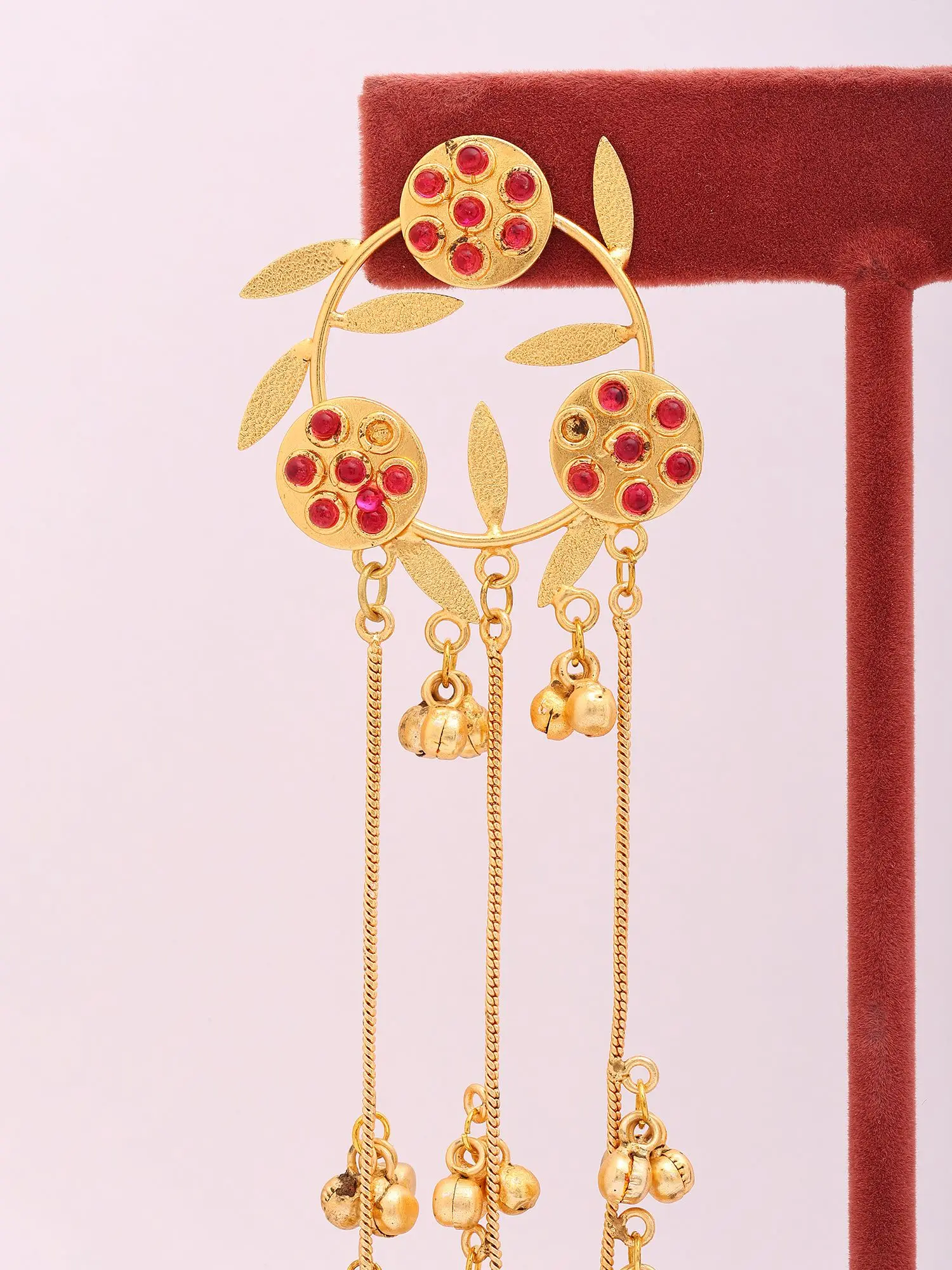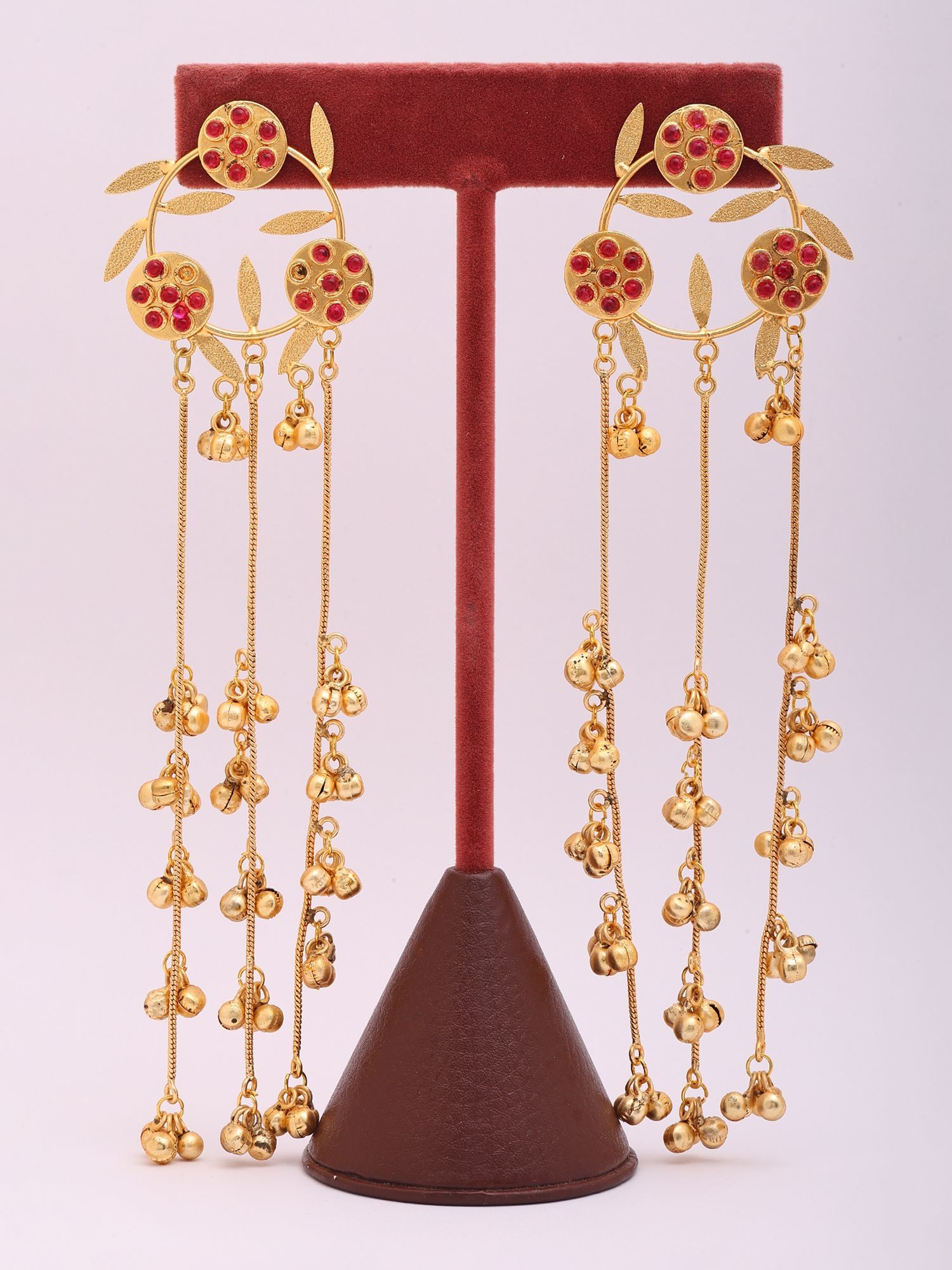 Each pair is meticulously shaped from lustrous brass, a testament to enduring quality and skilled craftsmanship. The circular framework, reminiscent of a stylized floral motif, is adorned with vibrant crimson stones, each carefully set by hand. Delicate leaf-like accents further enhance the natural elegance, while a cascade of fine chains, each tipped with a charming ghungroo, promises a delightful whisper of movement with every turn of your head.