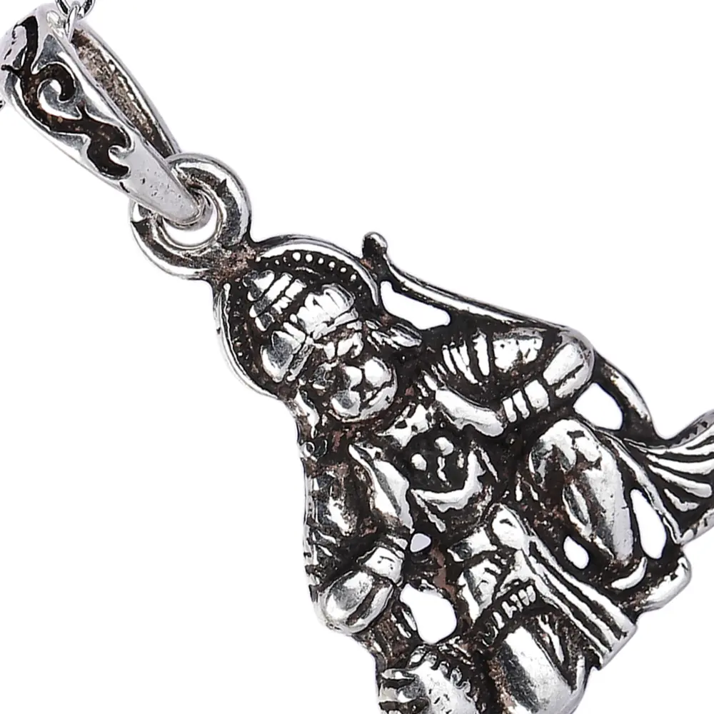 This exquisite pendant captures the essence of Lord Hanuman, the devoted servant of Lord Rama, in a truly remarkable portrayal. Crafted from high-quality sterling silver, this piece is more than just an accessory; it is a symbol of unwavering faith, courage, and devotion. The intricate detailing showcases Lord Hanuman in a seated posture, radiating a sense of calm power and spiritual grace. His divine presence is rendered with meticulous craftsmanship, reflecting the artistry and reverence dedicated to this revered deity.
