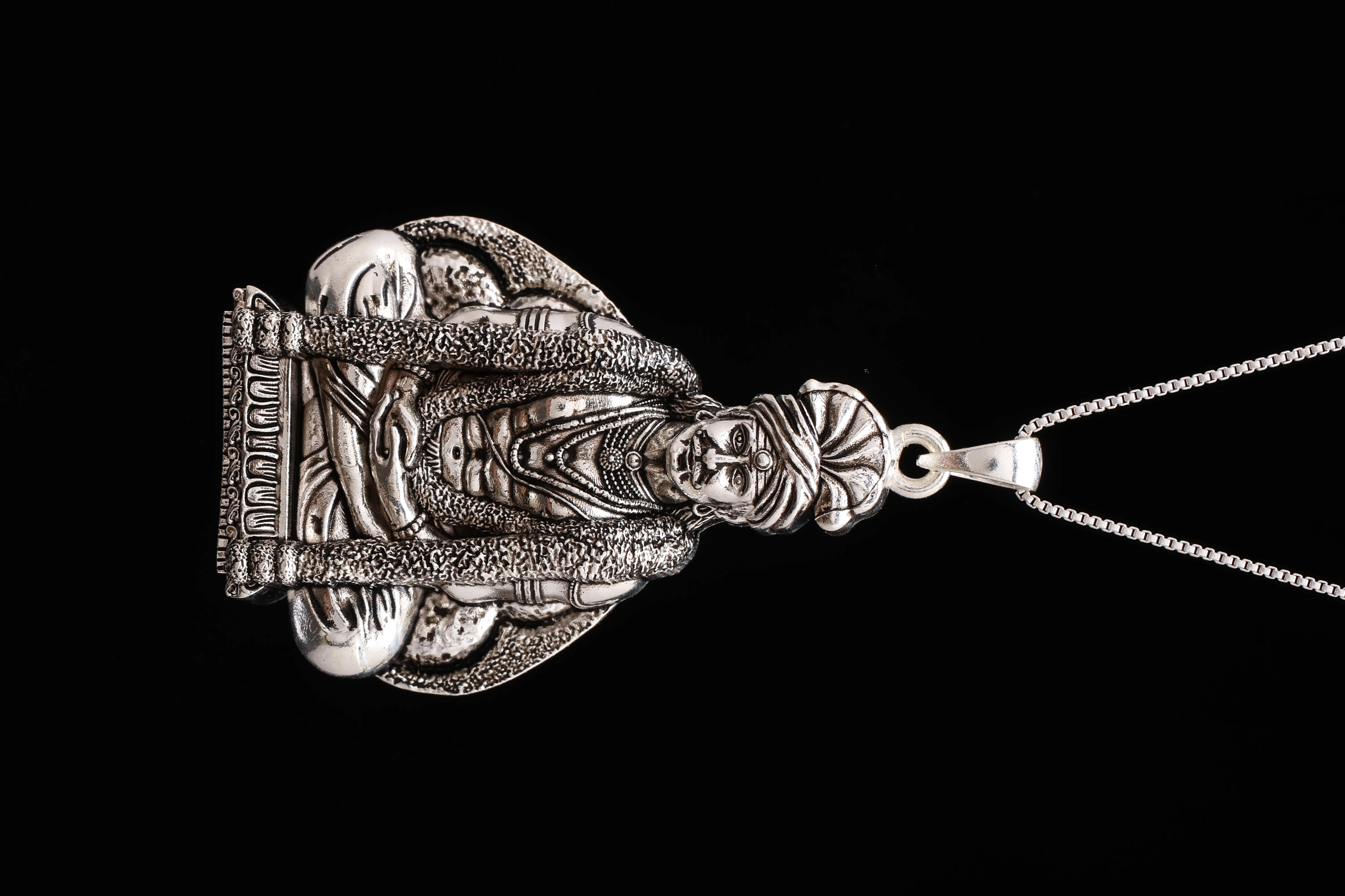 Measuring a commanding 2.25 inches in height and 1.30 inches in width, this pendant is designed to make an impression without being overpowering. The intricate rendering of Lord Muneeswarar Swami, complete with traditional attire and symbolic adornments, speaks volumes of its spiritual significance. You'll appreciate the nuanced textures and the way light plays across its polished surfaces, highlighting its exceptional quality.