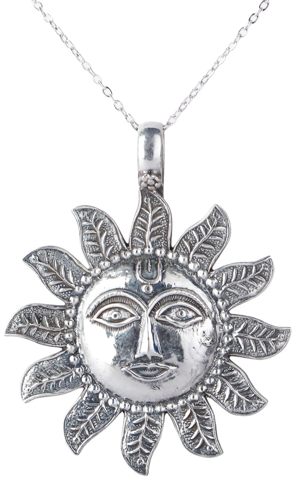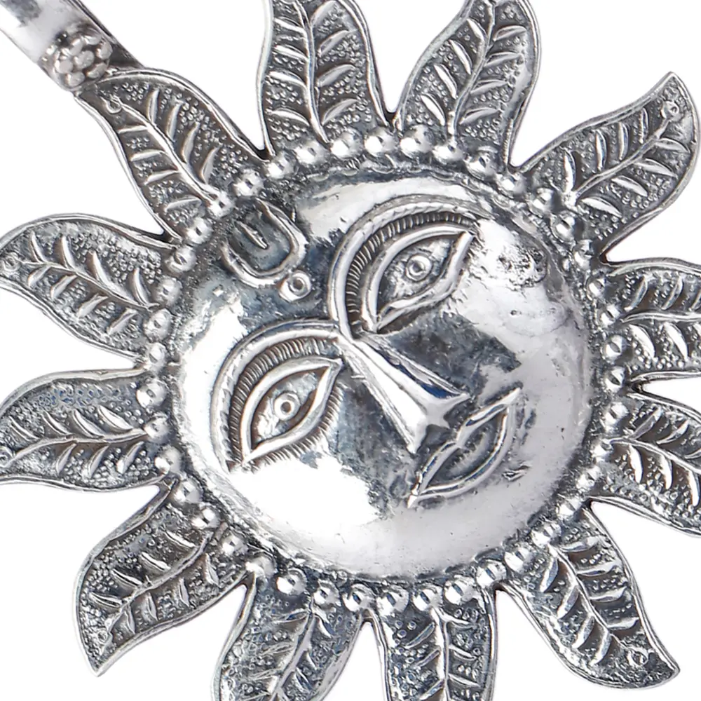 An artistically crafted Lord Surya Pendant in sterling silver, thoughtfully designed to embody the significance of the Hindu sun god, Surya. This intricately detailed piece not only serves as an elegant accessory but also carries the profound importance of invoking blessings, positive energy, and the divine radiance associated with Lord Surya. The sterling silver composition adds a touch of sophistication, enhancing the sacred essence of this pendant.