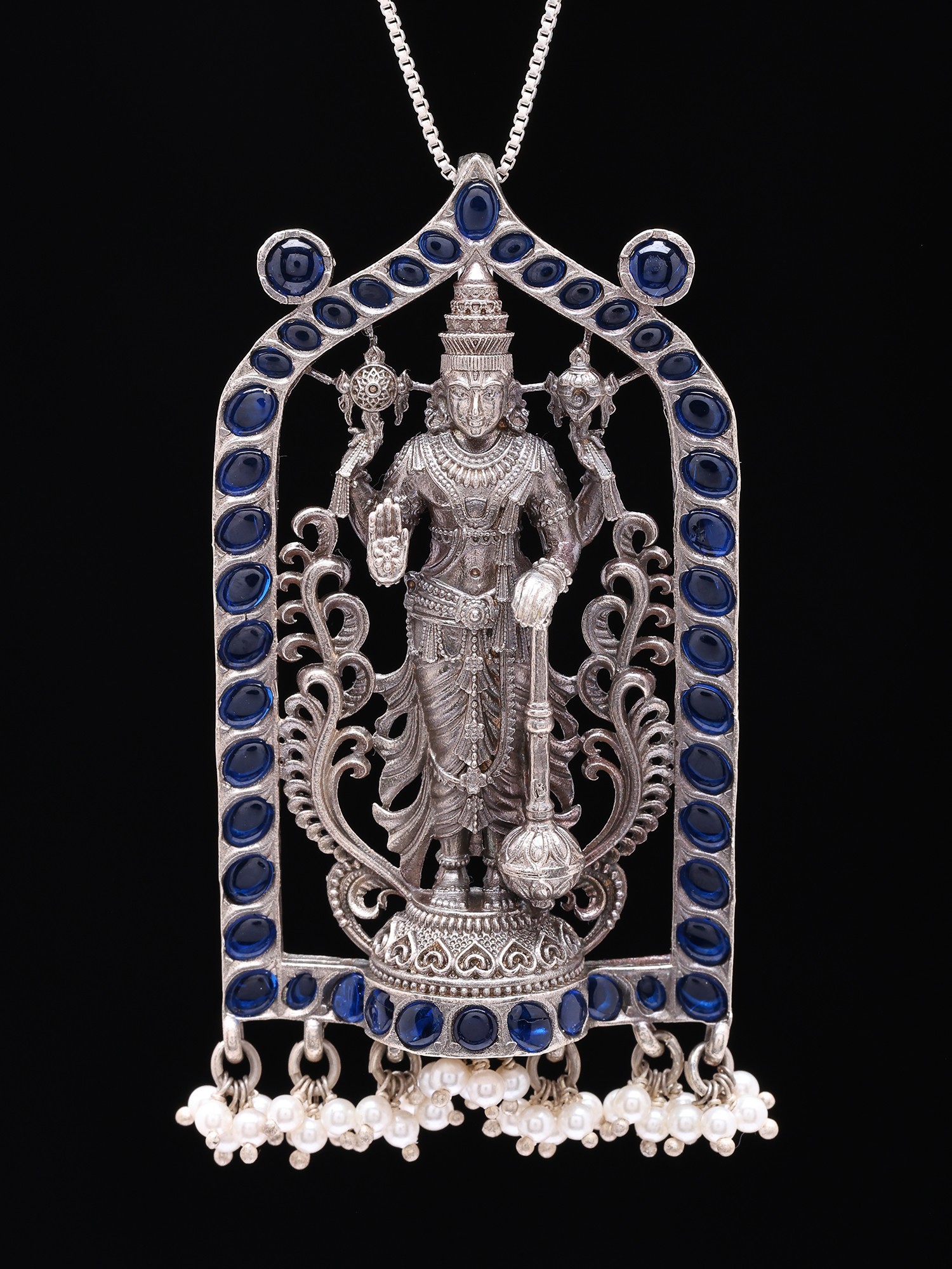 Meticulously crafted from the finest sterling silver, this pendant showcases the dedication of skilled artisans. Each intricate detail of the divine figure is brought to life through a process of skilled casting and meticulous finishing, resulting in a piece that feels substantial and enduring. The rich, oxidised finish lends it an antique allure, evoking the aura of revered temple artifacts passed down through generations. You'll appreciate the tactile quality and the inherent value of expertly worked precious metal.
