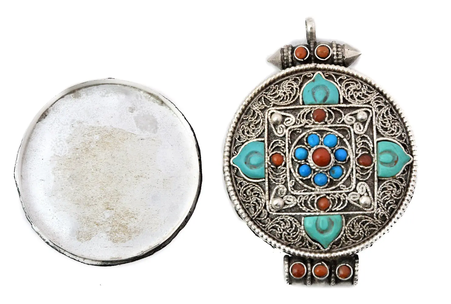 Mandala Gau Box Pendant with Coral, Turquoise and Filigree) - Made in Nepal