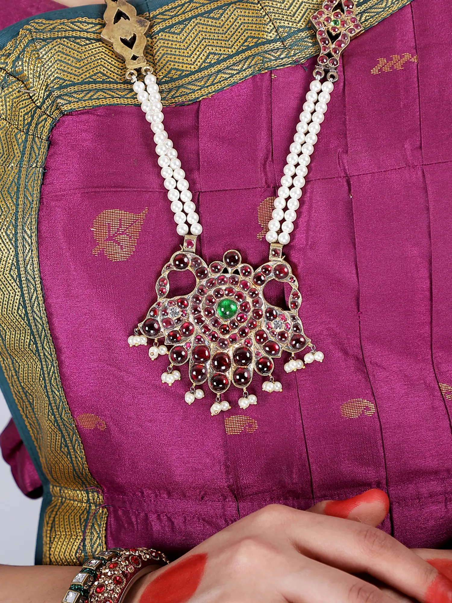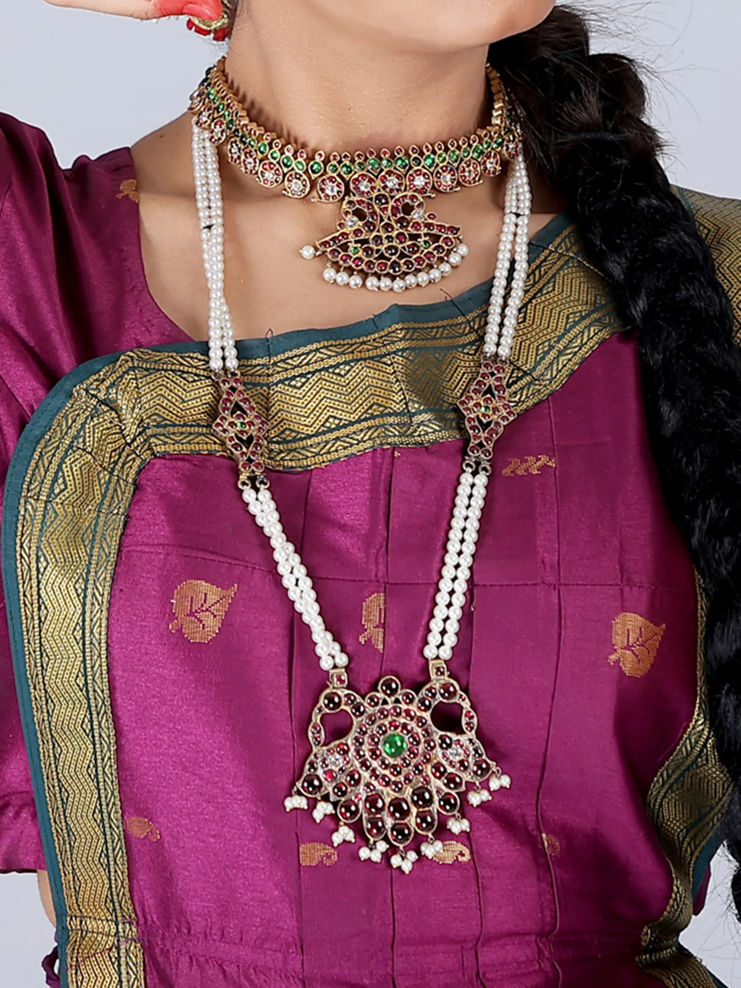 Embrace the beauty and elegance of this ancient art form by including this Mattal jewelry set into your dance journey. It will give a touch of beauty and tradition to your performances, making every moment on stage absolutely unforgettable, thanks to its superb craftsmanship and intriguing design. The short and long necklace decorated with peacock designs is composed of gold, semi-precious stones, and pearls, making it an exquisite example of luxury and art. It adorns the neck gracefully, accentuating the dance motions and adding a touch of classic charm.