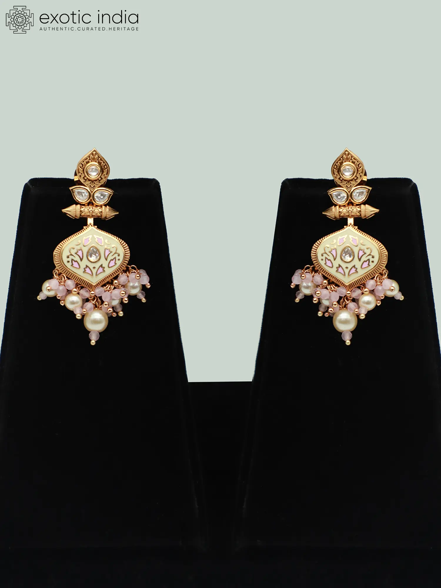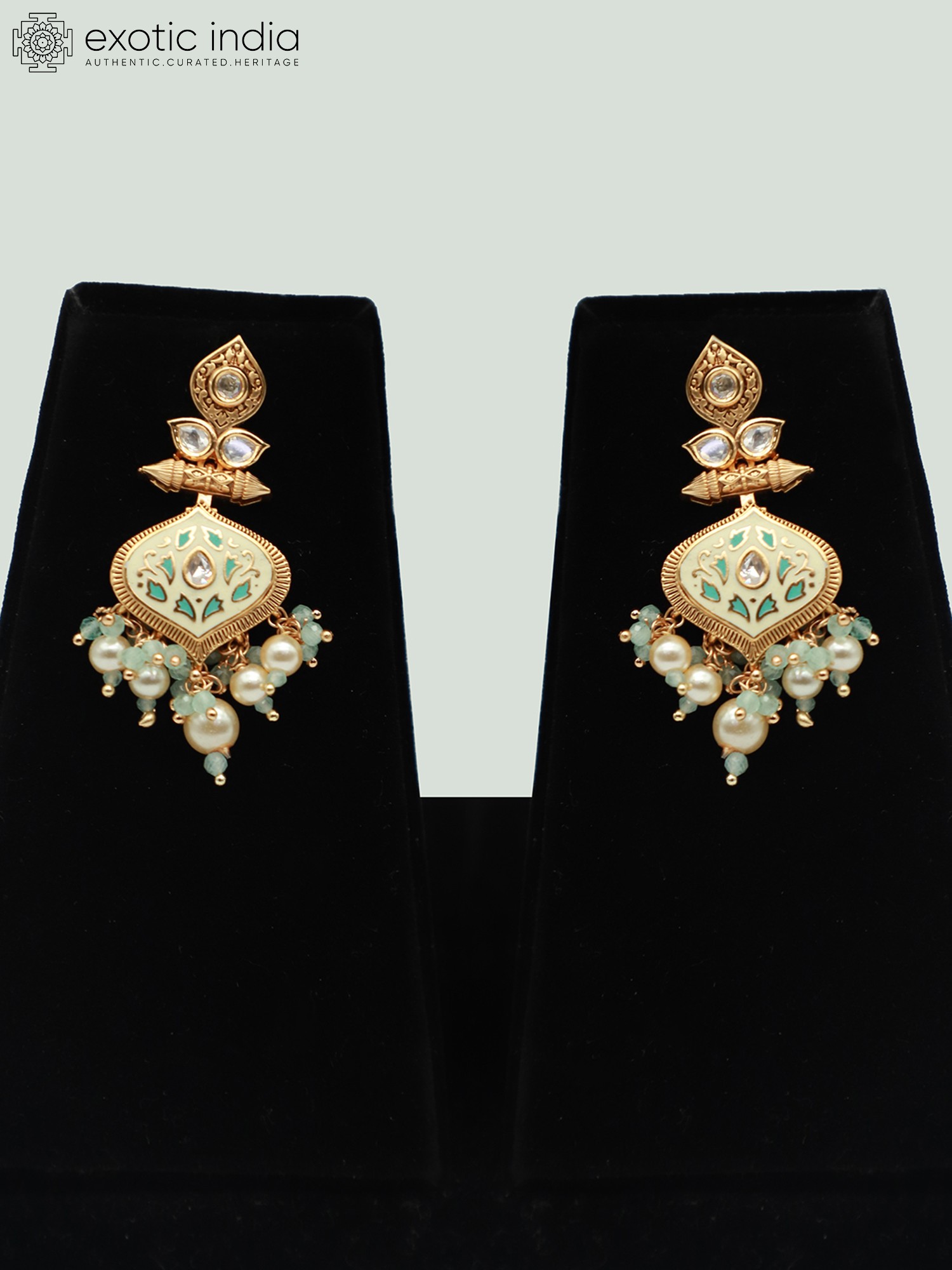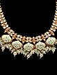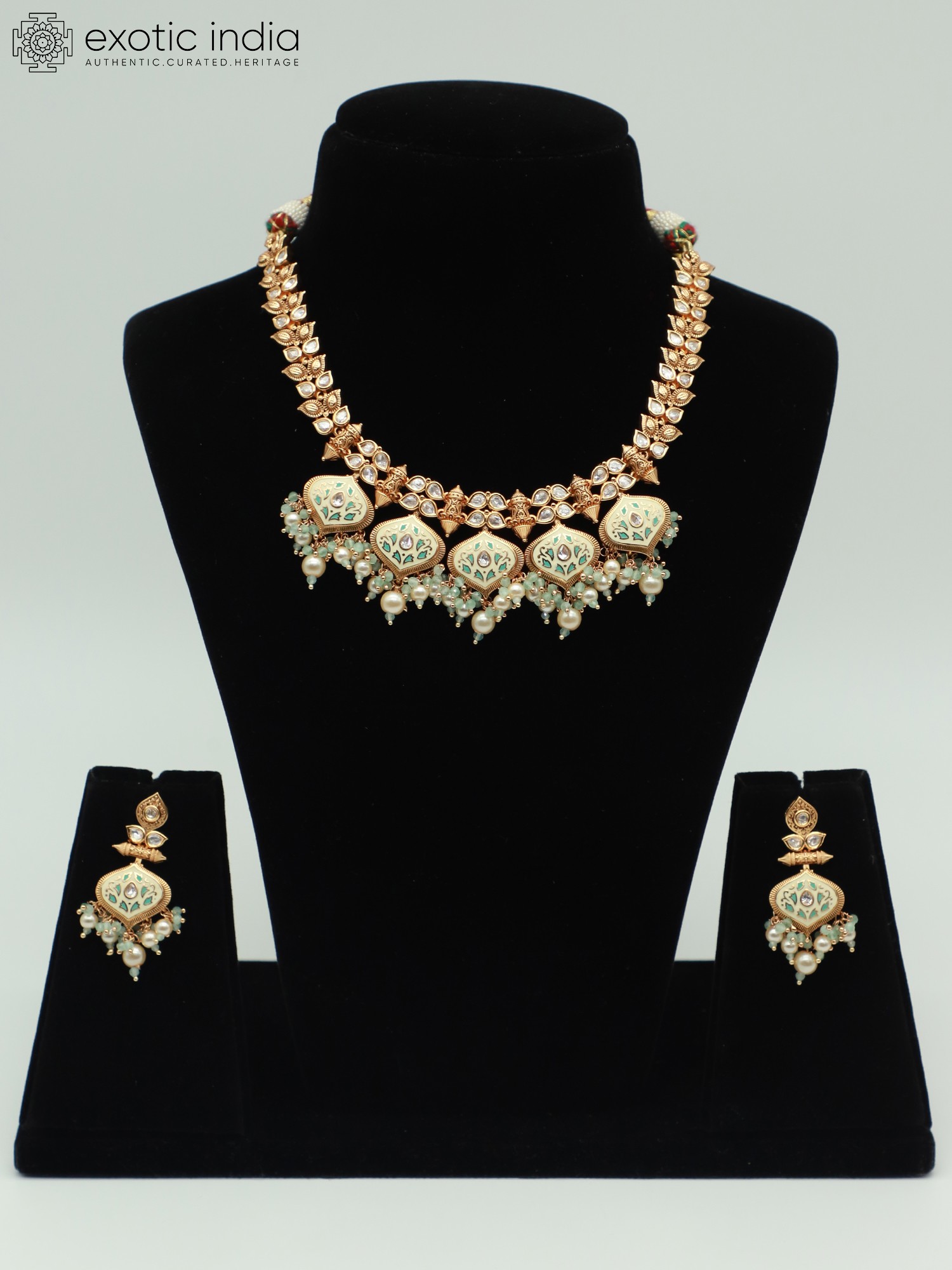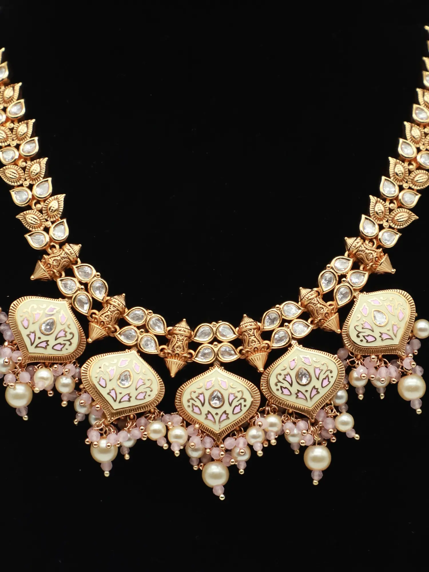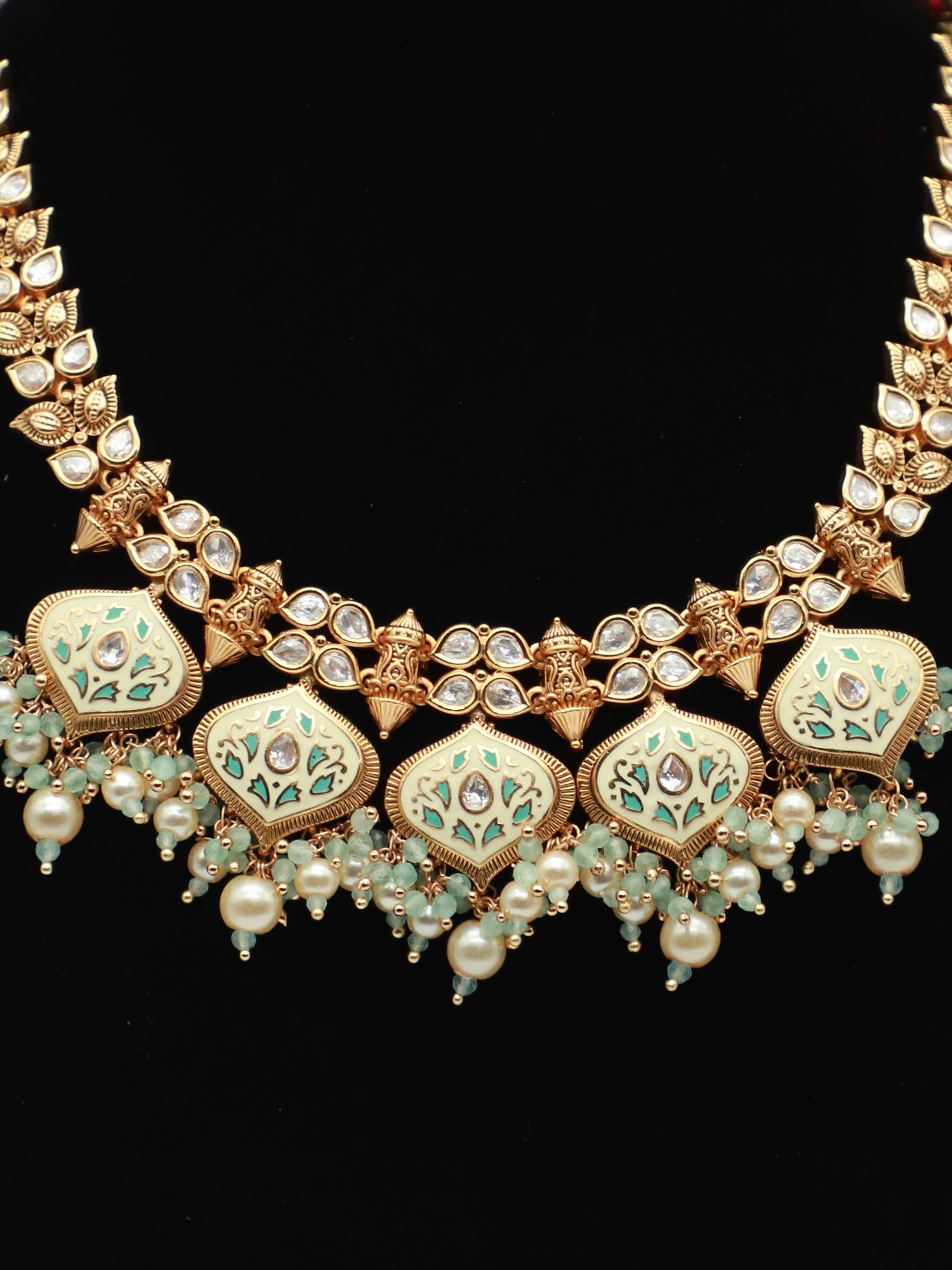 Floral Leaf Stone Studded Moissanite Kundan With Monalisa Beads Elegant Necklace With Earrings