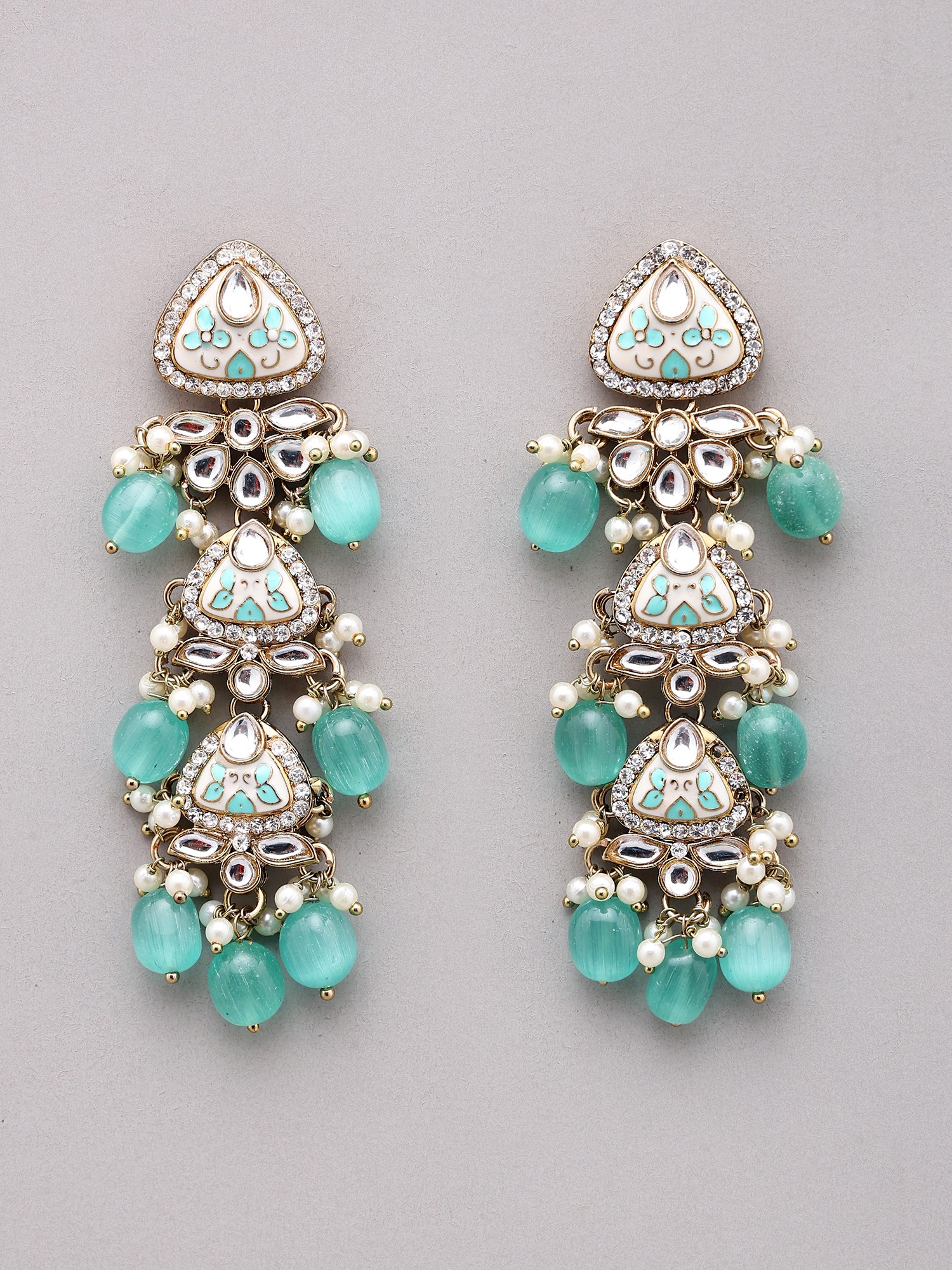 Green Kundan Jhumka Earrings with Pearl & Bead Drops