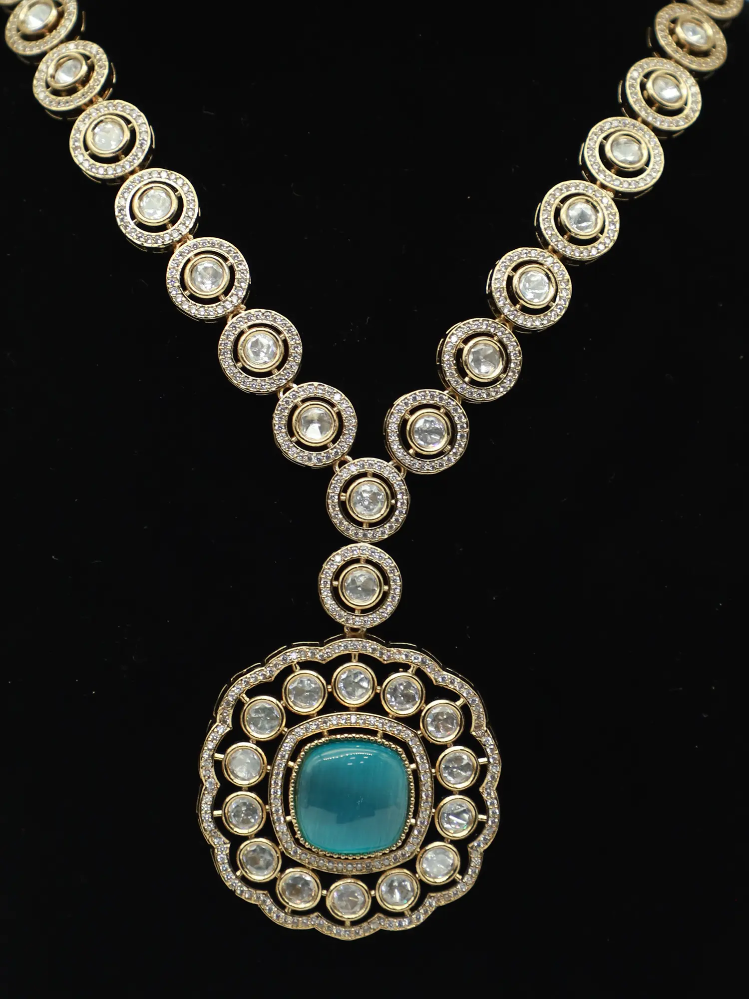 This necklace and earring set is versatile enough to complement a wide range of styles and occasions. Whether you're attending a wedding, a gala, or simply want to add a touch of glamour to your everyday look, this set will effortlessly elevate your ensemble. Pair it with a classic saree or a modern cocktail dress to create a memorable and sophisticated statement. The timeless design and exquisite craftsmanship ensure that this set will remain a cherished piece in your jewelry collection for years to come.