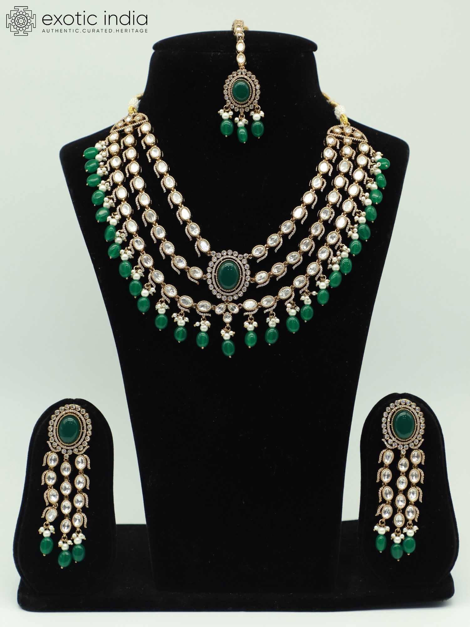 The accompanying earrings mirror the design elements of the necklace, creating a cohesive and polished look. They dangle gracefully, adding a touch of movement and sparkle to your visage. The stones are meticulously placed to maximize their brilliance, ensuring that they catch the light from every angle. Comfortable and secure fastenings ensure a worry-free wear. Completing the set is a matching mangtika, designed to adorn the forehead with a delicate touch of glamour. Its intricate design mirrors the aesthetic of the necklace and earrings, ensuring a harmonious and balanced appearance. The mangtika is lightweight and comfortable to wear, making it perfect for extended occasions.