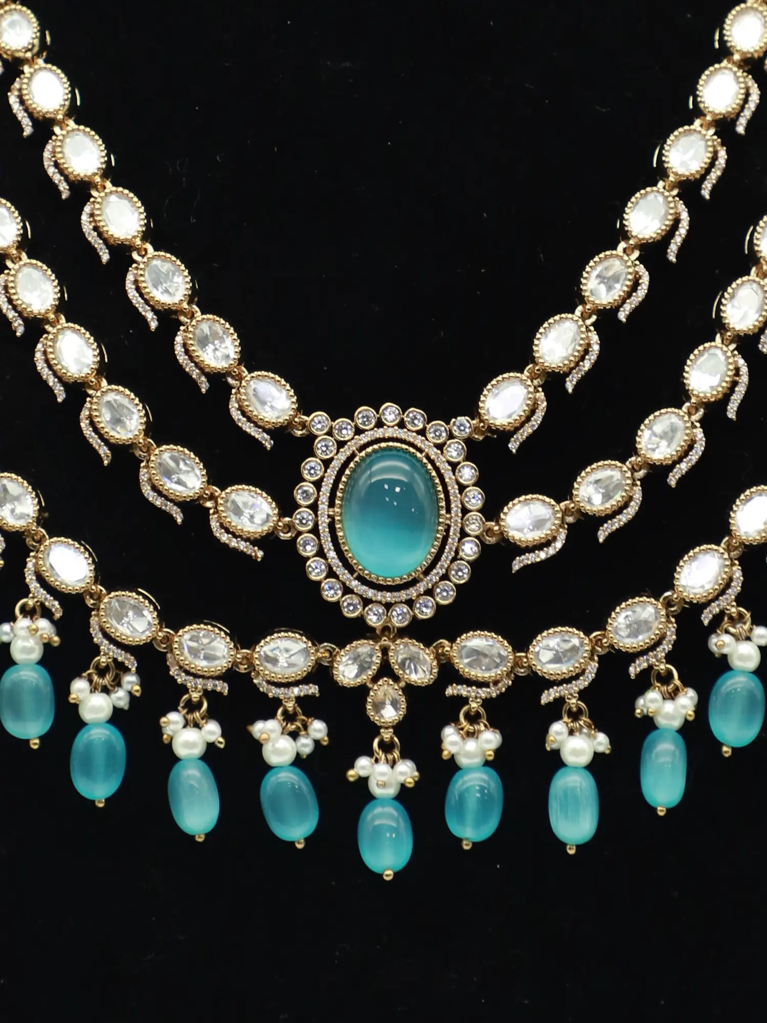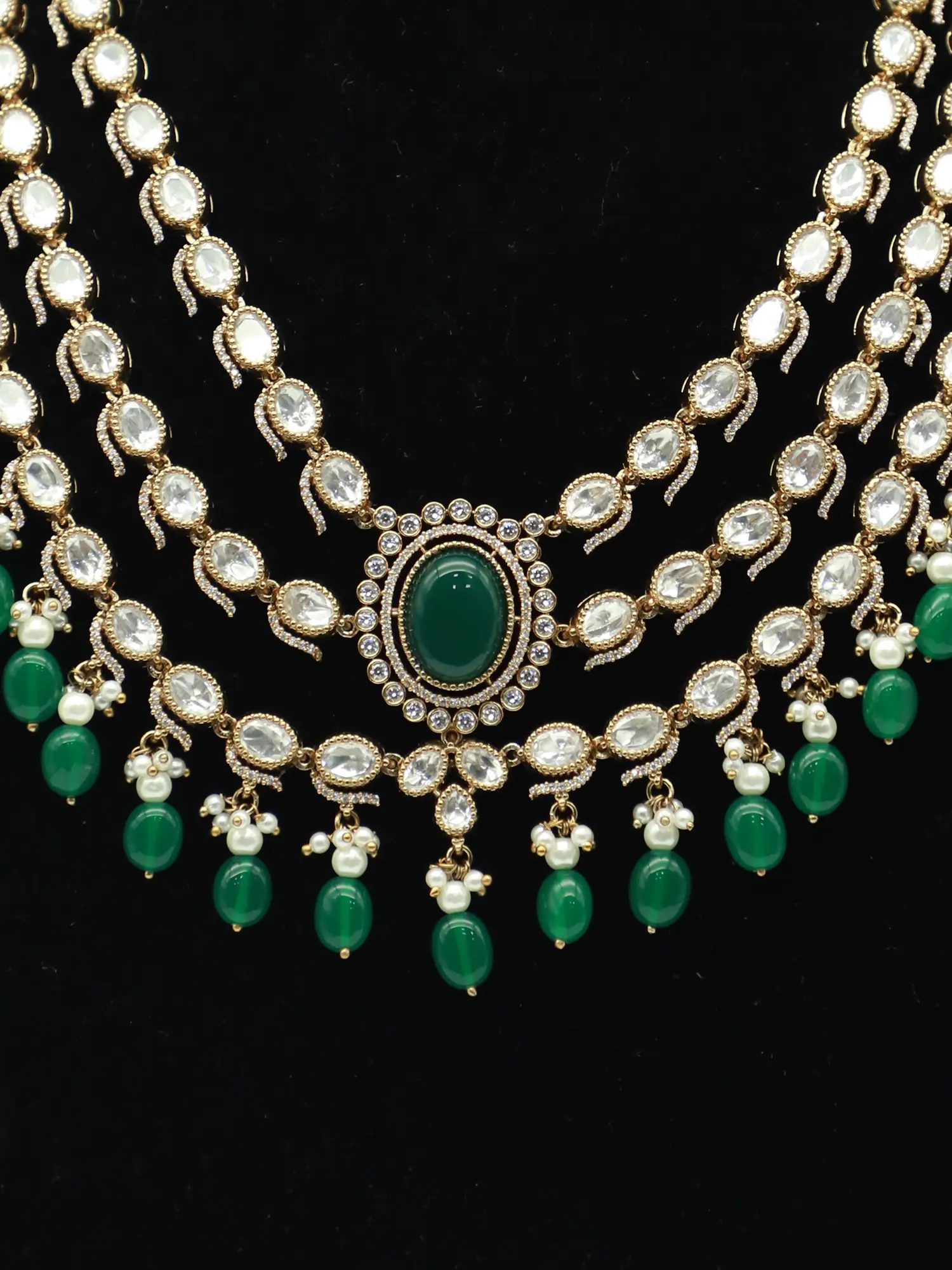 Envelop yourself in the captivating allure of this exquisitely crafted jewelry set. This ensemble is a harmonious blend of traditional design and contemporary flair, perfect for adding a touch of regal sophistication to any occasion. The rich, vibrant hues and intricate detailing make it a standout piece that will undoubtedly garner attention and admiration. The necklace is the centerpiece of this stunning set. It features three cascading layers, each adorned with gleaming stones that catch and reflect the light with every movement. The central pendant is a mesmerizing focal point, drawing the eye with its captivating design and luxurious finish. Delicate beadwork adds a touch of whimsy and movement, enhancing the overall elegance of the piece.