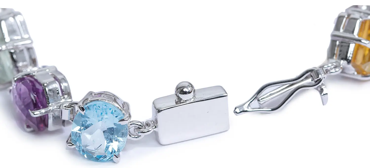 This special bracelet is made up of 7 different kinds of gemstones, namely, blue Topaz, amethyst, green amethyst, smoky quartz, black spinel, lemon topaz, citrine. They are encased and linked together in sterling silver, measuring 8.5 inches in length. The different gemstones represent purity, spiritual protection, calmness, love, affection, success and joy. The healing properties of these stones are known to bless its wearer and many believe they all help to ward off evil by blessing its wearer with strength and courage.