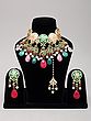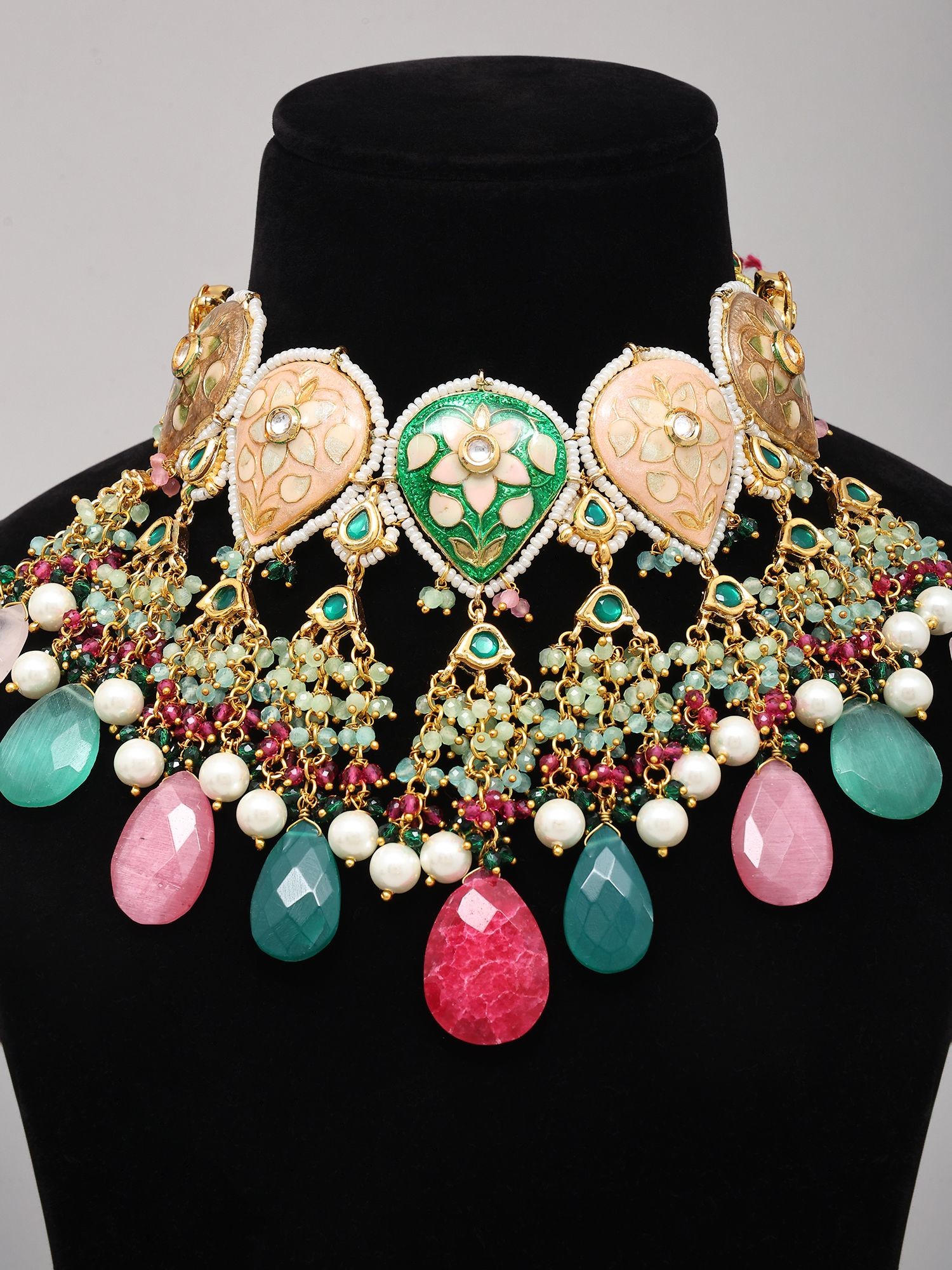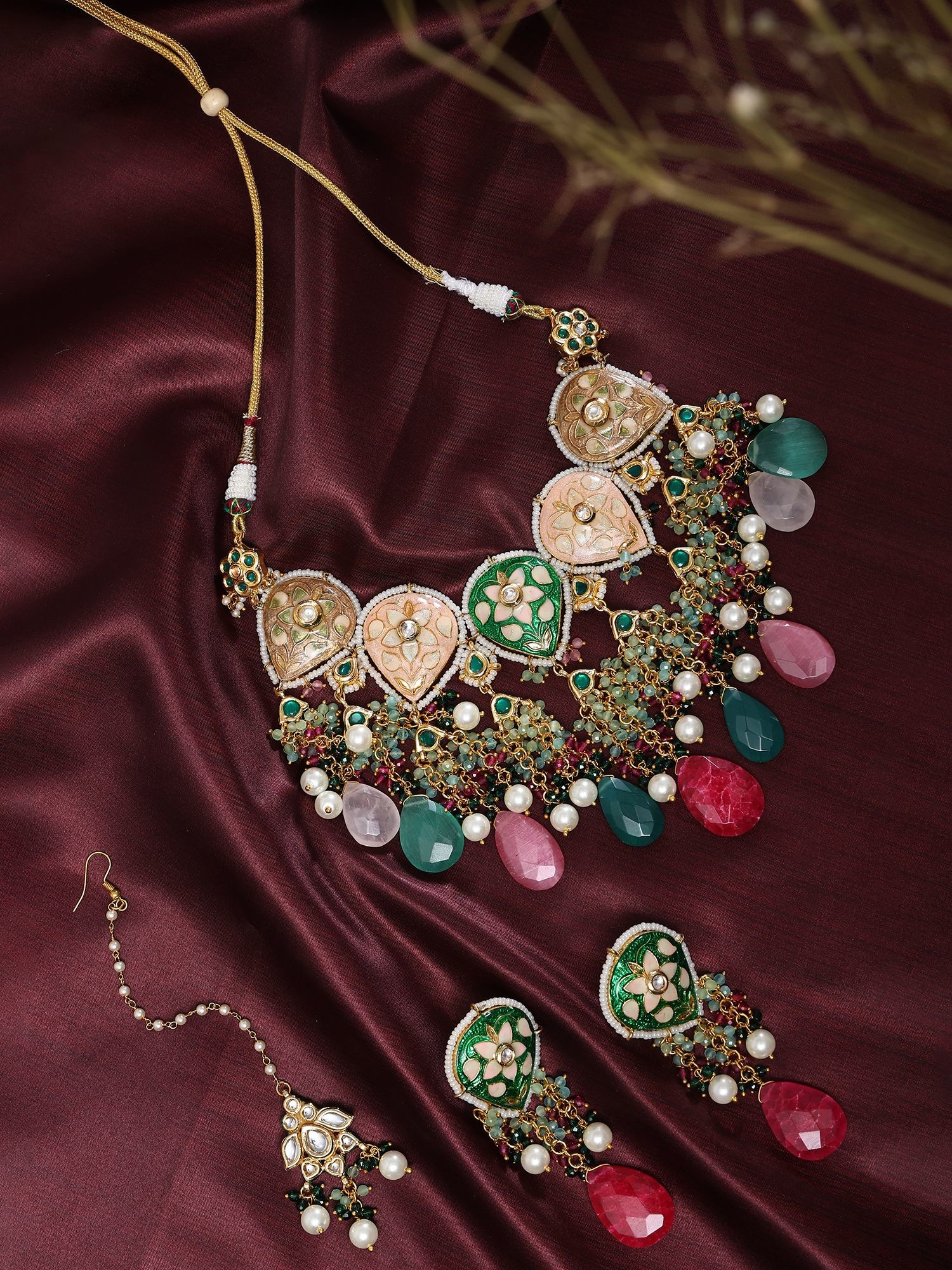 Multi-Colored Meenakari Kundan Necklace Set with Beaded Drops, Earrings & Maang Tikka