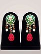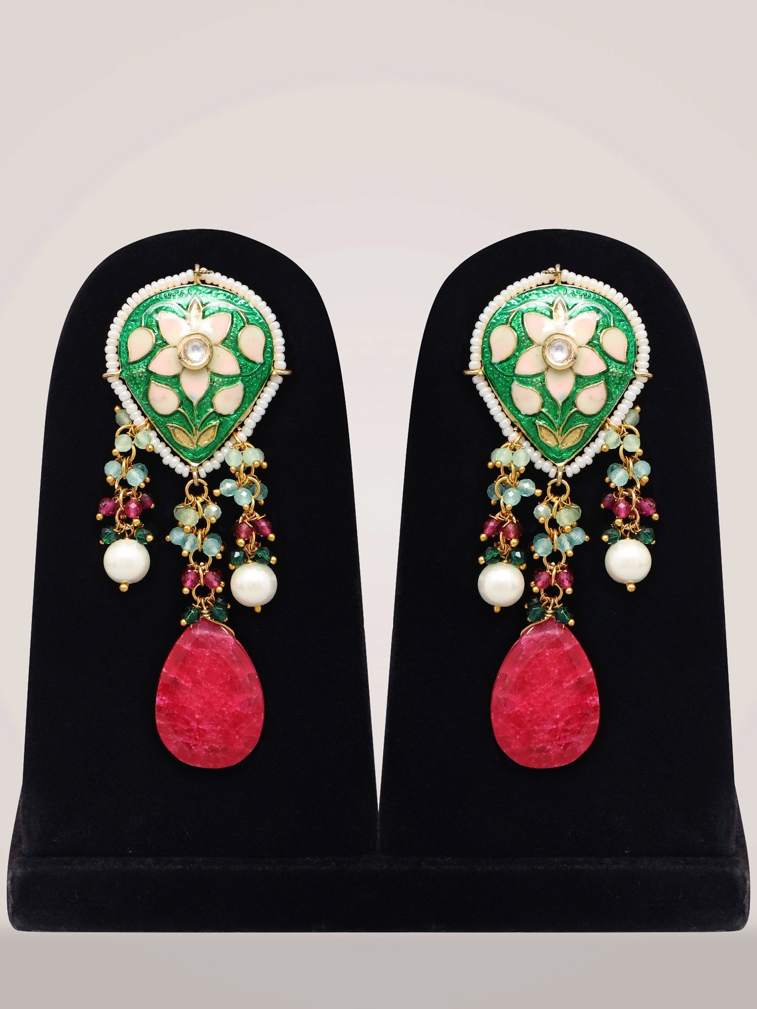 Intricate Meenakari enamel work adorns the teardrop pendants.