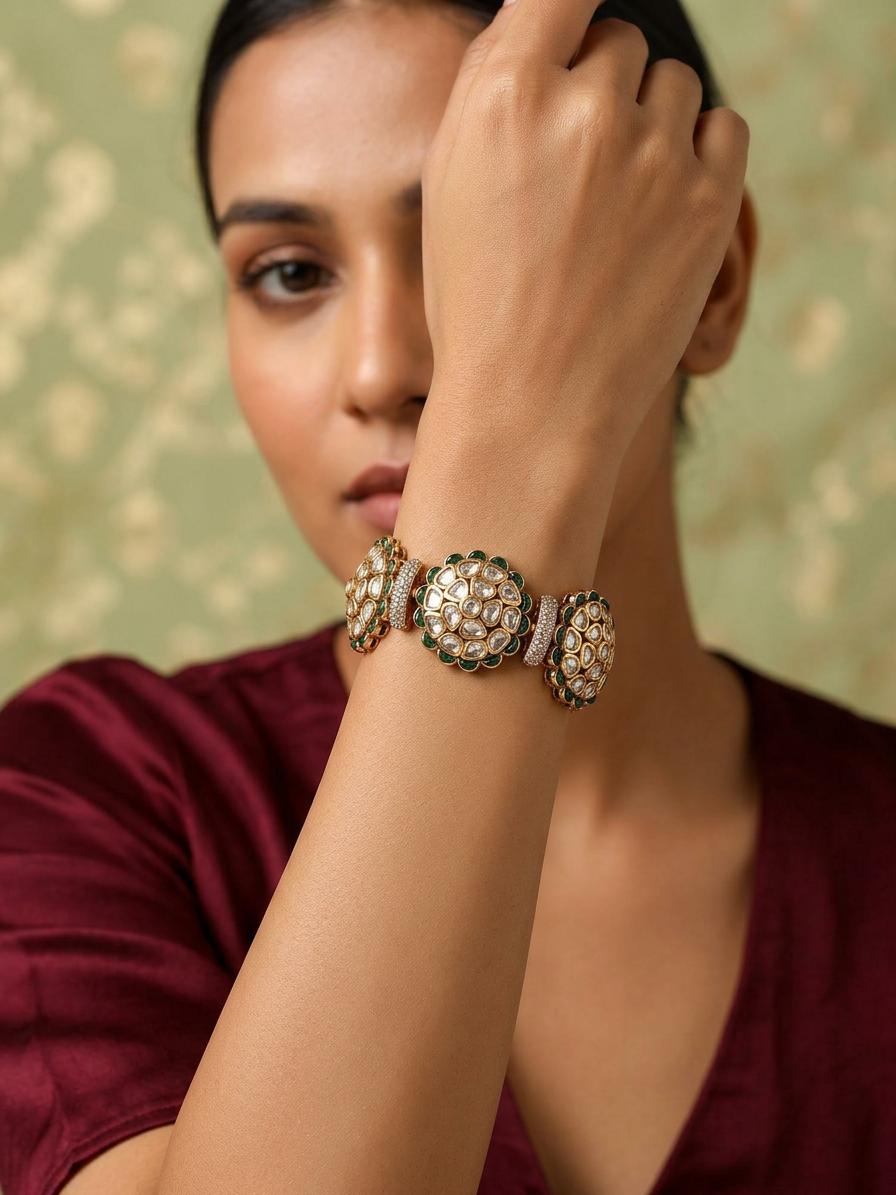 Green Stone Studded Floral Openable Kundan Bracelet