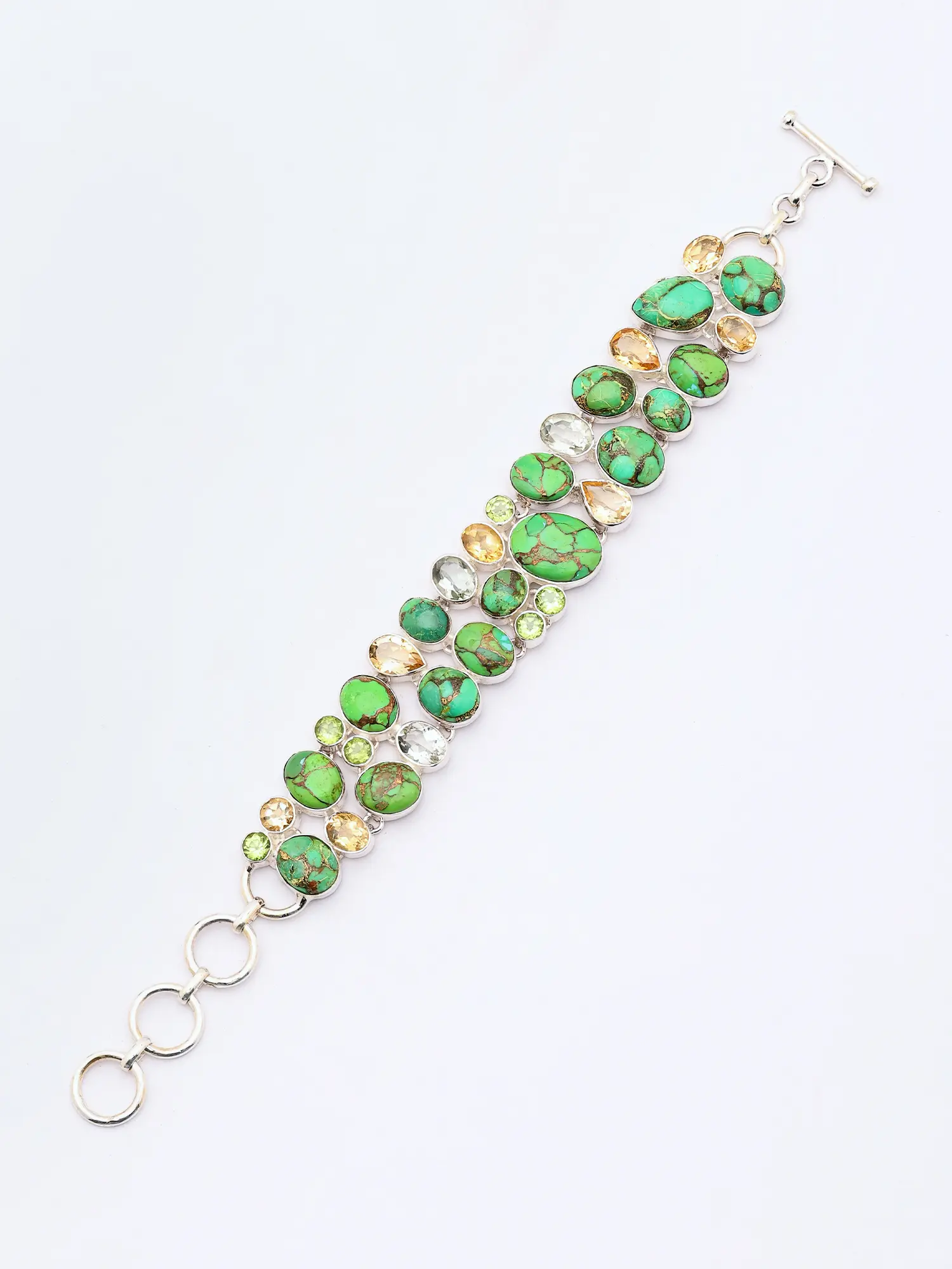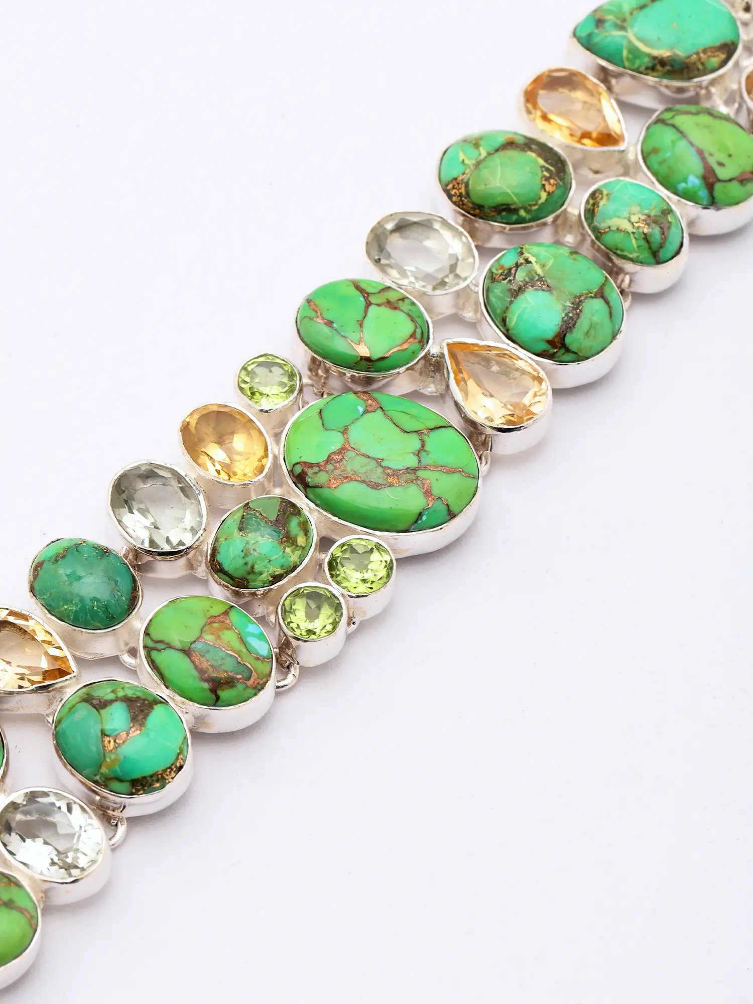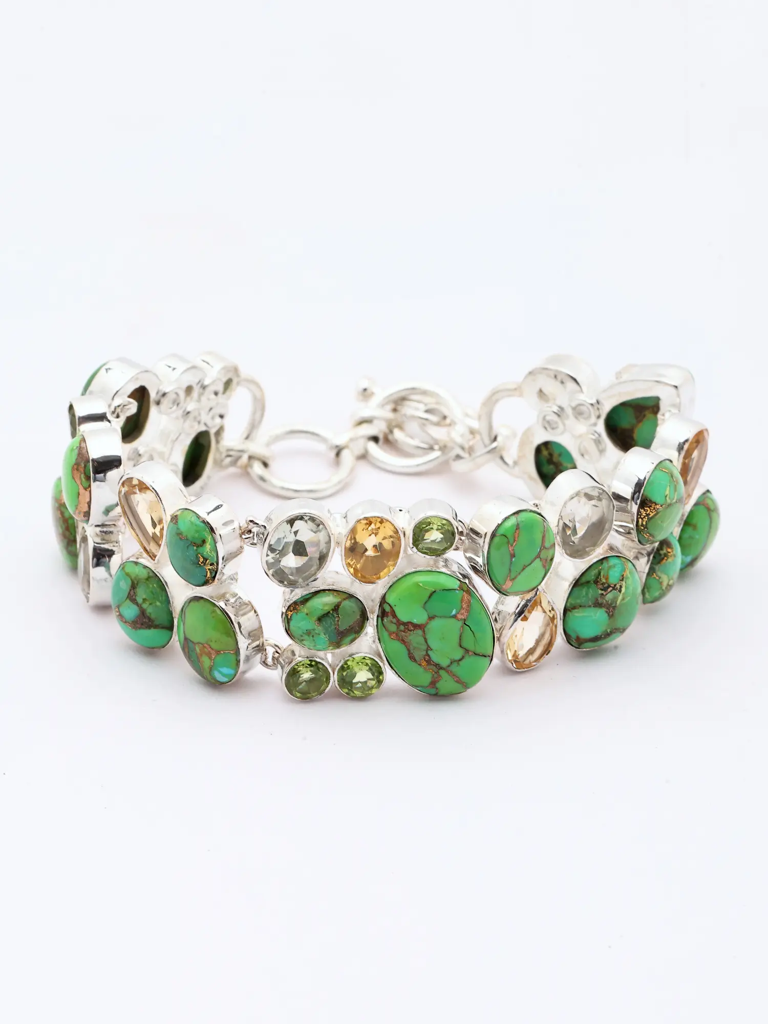 Adorn your wrist with a cascade of vibrant color and exquisite craftsmanship. This stunning bracelet is a testament to nature's artistry, featuring a captivating arrangement of multi-gemstones meticulously set in lustrous sterling silver. Each stone tells its own story, from the deep, earthy greens to the bright, playful citrine hues, creating a dynamic and eye-catching piece that is sure to become a treasured addition to your jewelry collection.