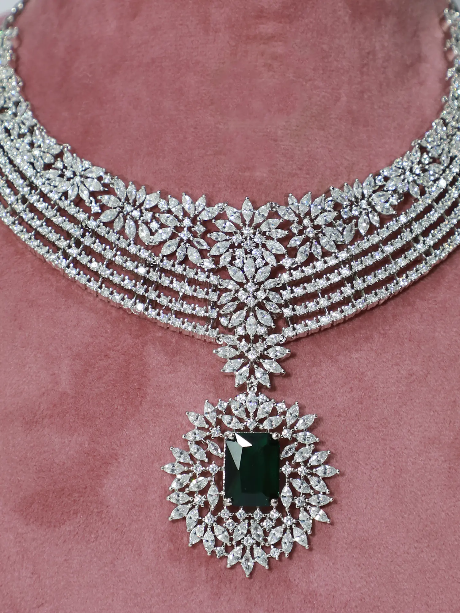 This necklace set is a testament to meticulous craftsmanship. Each American Diamond is carefully set to maximize its brilliance, creating a mesmerizing play of light with every movement. The floral designs are intricately detailed, adding a touch of romance and charm. The ruby stone at the heart of the pendant is cut and polished to perfection, radiating a rich and captivating hue. The silver polish base provides a durable and lustrous finish, ensuring that this necklace set will remain a cherished part of your jewelry collection for years to come.