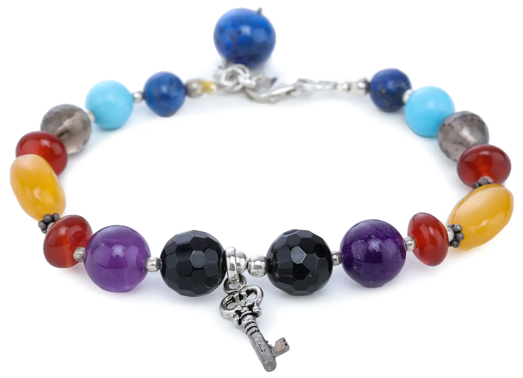 The bracelet features accents of genuine sterling silver. Gleaming silver beads separate each gemstone, adding a touch of refinement and creating a visual rhythm that enhances the bracelet's overall appeal. A charming key pendant dangles playfully from the bracelet, adding a whimsical touch and a hint of mystery. The secure clasp provides peace of mind, ensuring that this cherished piece remains safely fastened throughout your day.