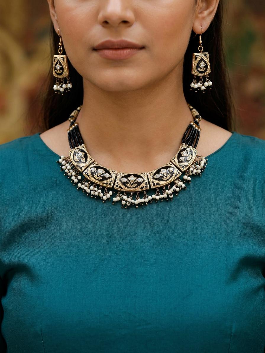 Indulge in the timeless elegance of this stunning necklace set, a perfect blend of classic Indian artistry and contemporary style. This piece captures the essence of traditional jewelry with a modern twist, making it an ideal accessory for various occasions. The intricate design features a series of meticulously crafted metal elements, artfully arranged to create a harmonious and eye-catching composition. The necklace showcases a striking combination of colors and textures. Dark shades beautifully highlight delicate stone detailing. The necklace chain itself is comprised of several strands of fine beads to bring out the overall appeal of the necklace. The overall design evokes a sense of regality and sophistication.