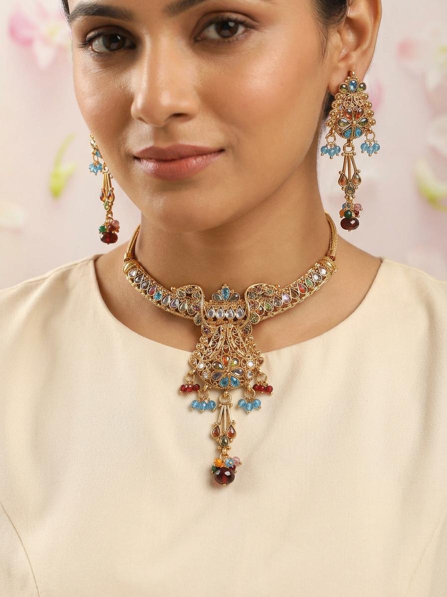 Adore yourself with sophistication using our multi-stone fashion choker necklace with an earring set. This exquisite ensemble harmoniously blends an array of colorful stones, creating a captivating and stylish accessory. The choker design adds a touch of modern flair, making it a perfect complement to various outfits. The matching earrings complete the set, providing a cohesive and elegant look.