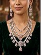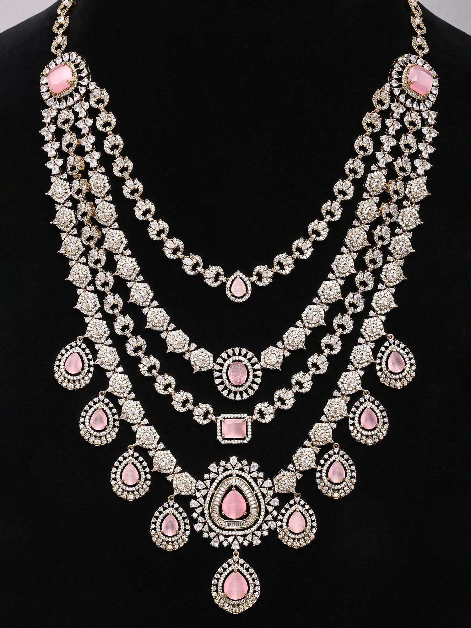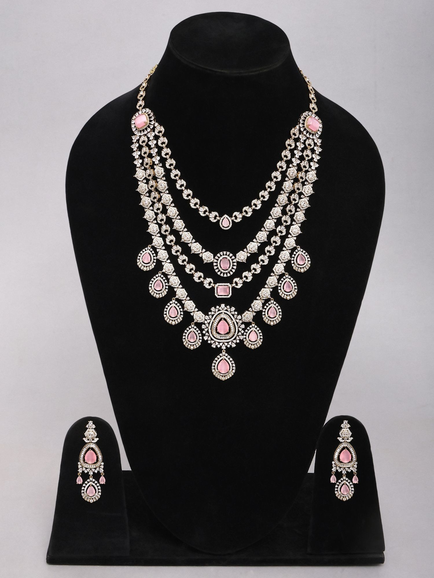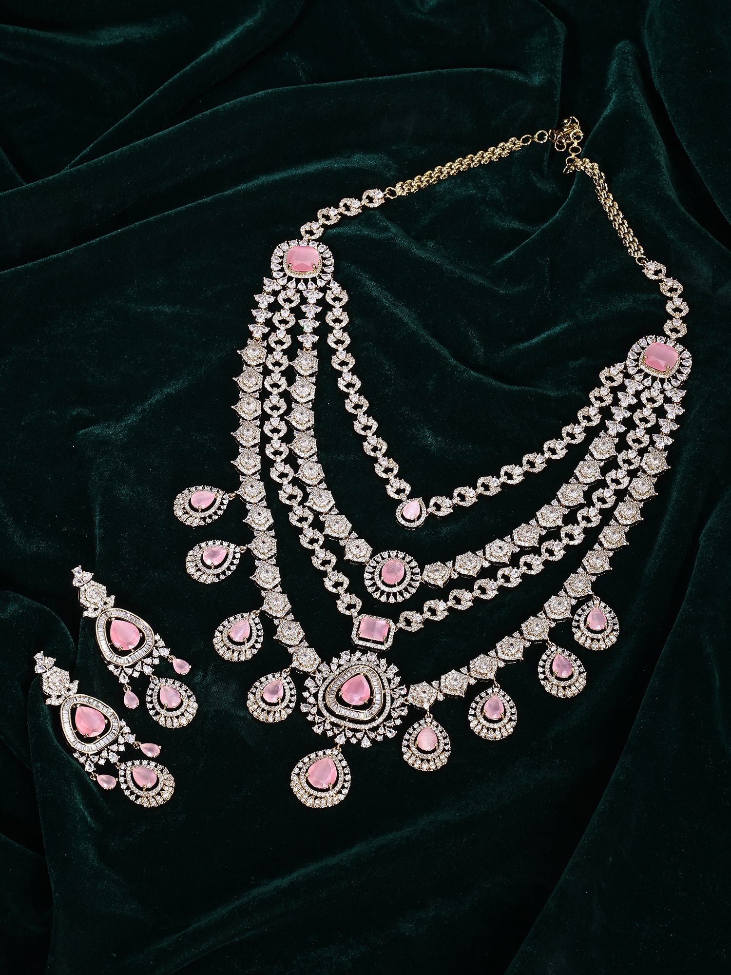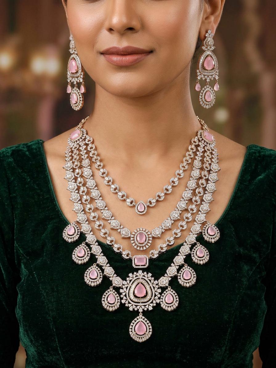 Multi-Strand American Diamond Bridal Necklace Set with Pink Stone Earrings