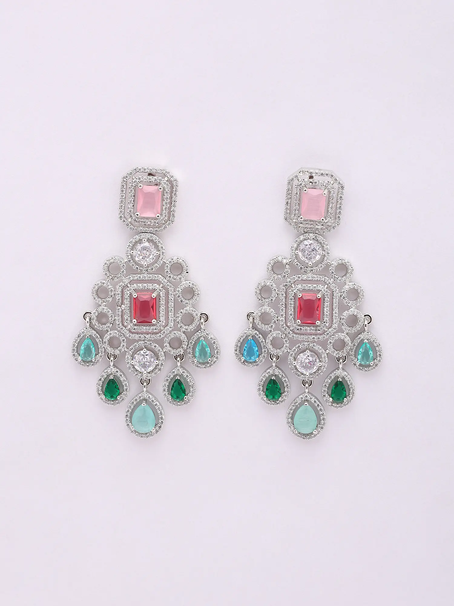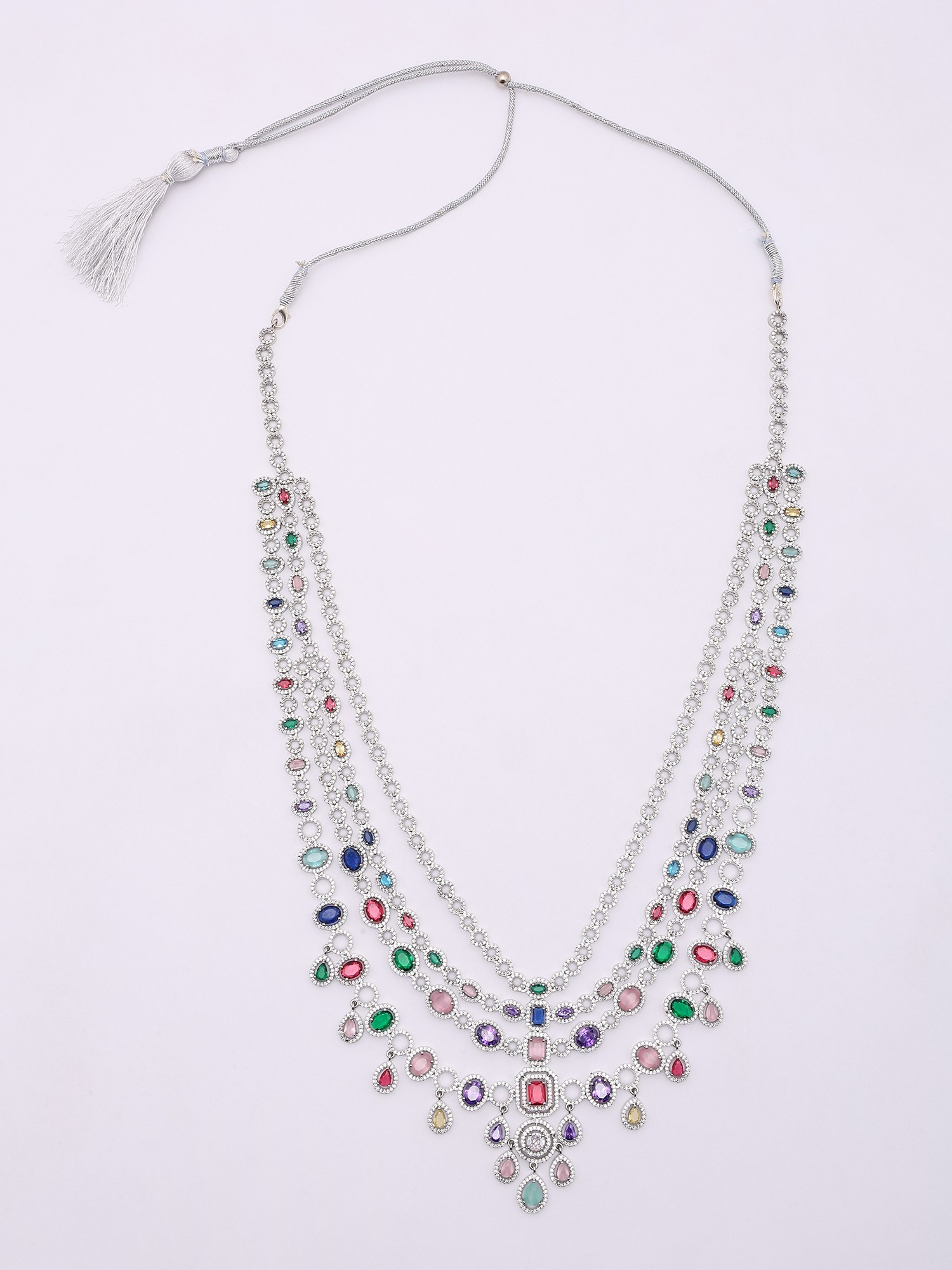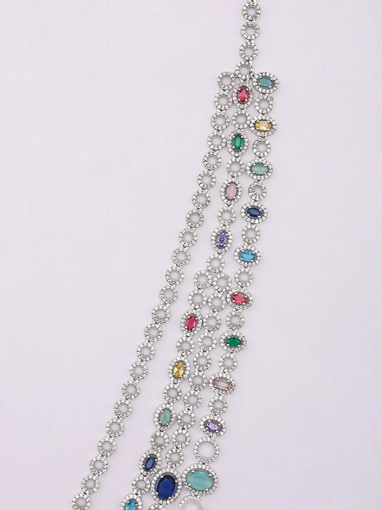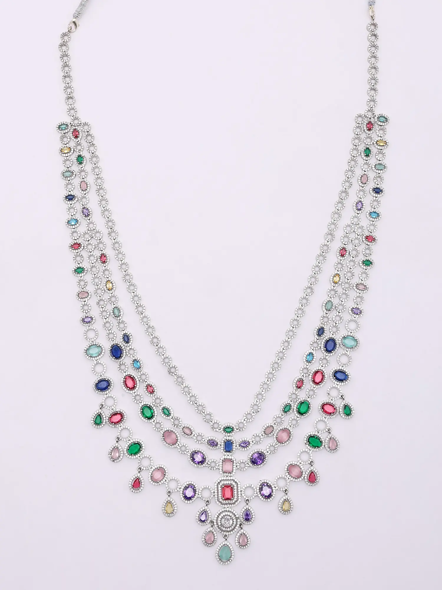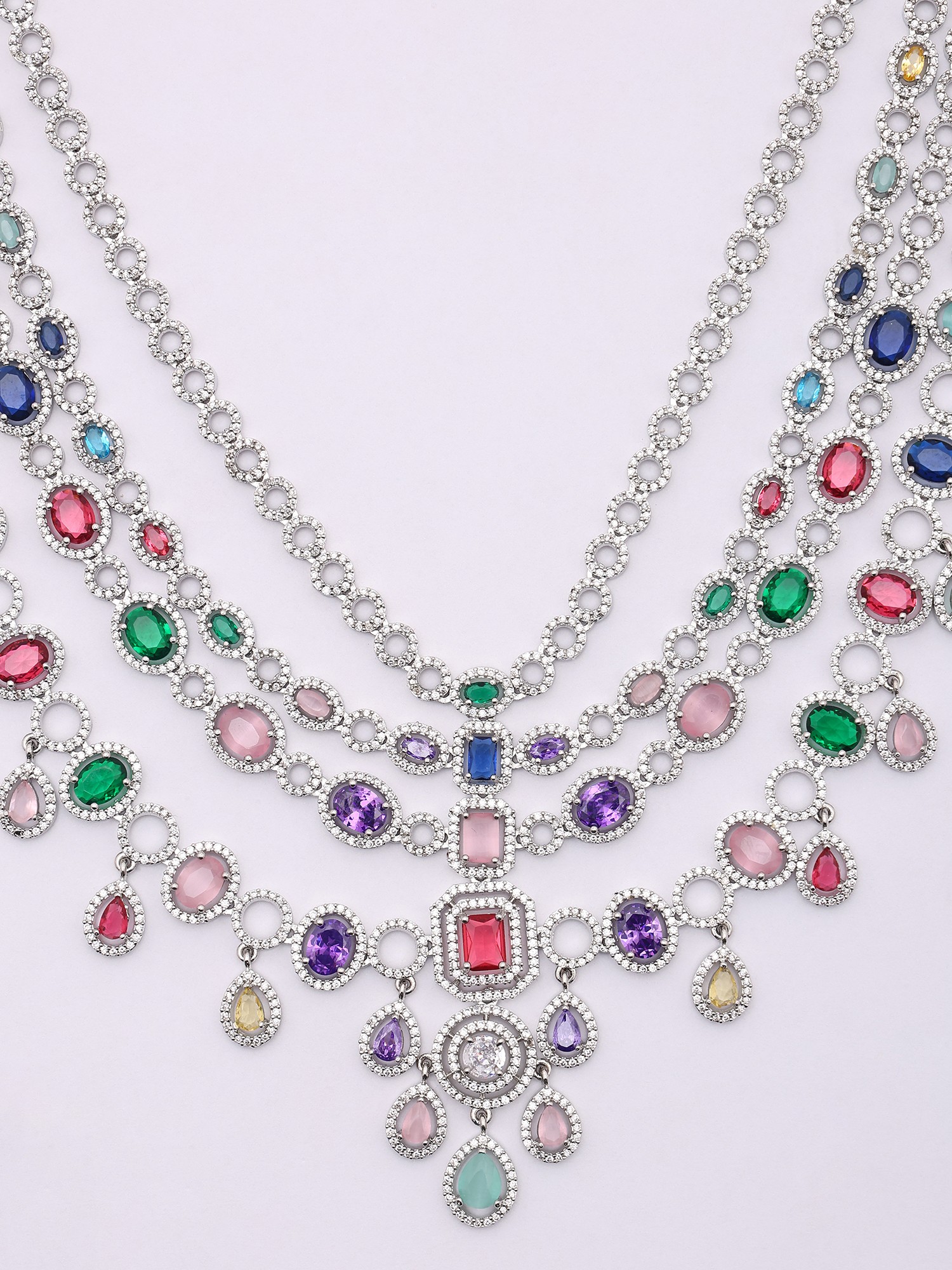 Multi-Strand Navratna Style American Diamond Bridal Necklace Set with Statement Earrings