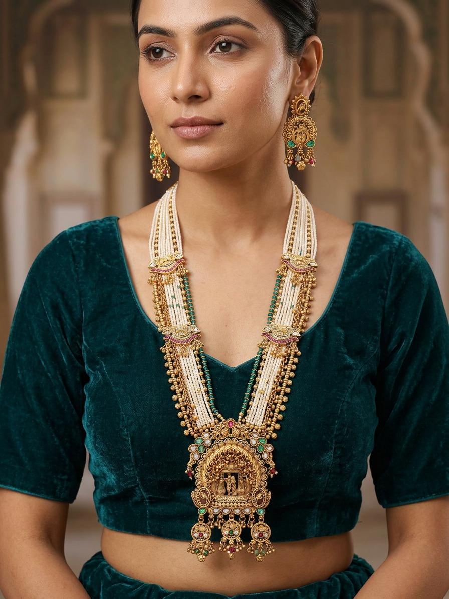 You'll be captivated by the interplay of multiple strands, comprised of delicate white beads and accented with rich emerald green beads and lustrous gold accents. The centerpiece unfolds to reveal a devotional scene, intricately carved and framed by vibrant stones and ornate gold embellishments. Complementing the necklace are elegant earrings, each echoing the detailed artistry of the main piece, designed to sit gracefully at 1.70 inches in height and 0.75 inches in width. The necklace itself cascades with a striking 14-inch height, ensuring a commanding presence.