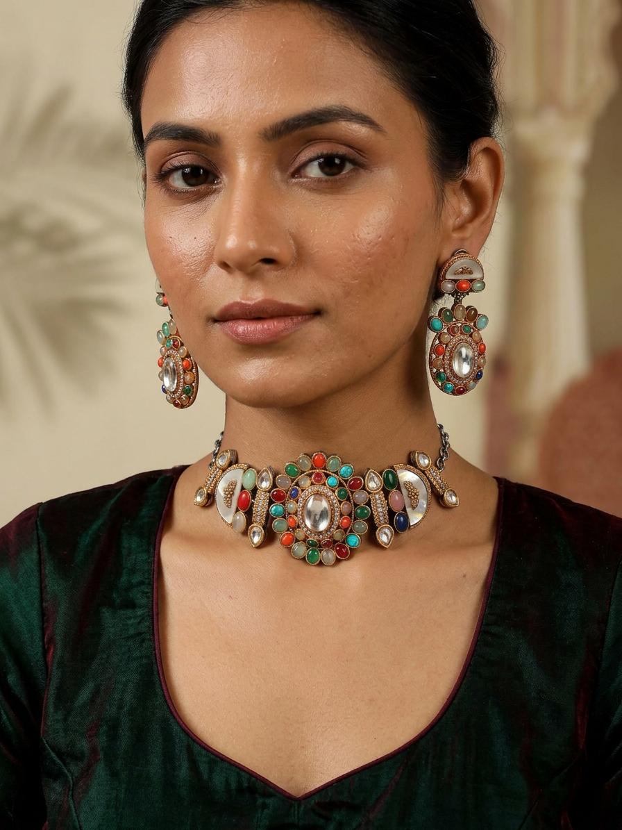 Majestic Multicolored Stone Studded Choker Set with Earrings