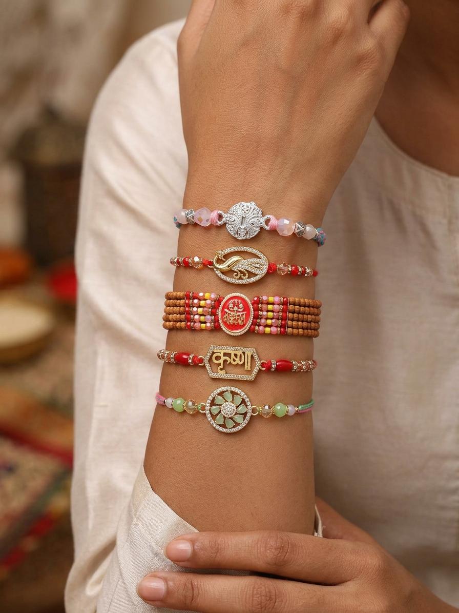 This set features five distinct Rakhis, each with its own unique charm and appeal. One Rakhi boasts a dazzling centerpiece adorned with shimmering accents, set against a delicate thread that speaks of understated elegance. Another showcases an intricately designed charm, adding a touch of tradition and auspiciousness to the festive occasion. Yet another makes use of natural wooden beads, offset with bright color accents, making for a distinct look. The other two rakhi designs feature pendants, either golden or silver. These Rakhis are not just beautiful accessories; they are tokens of love and protection that your brother can cherish for years to come. The carefully selected materials and expert craftsmanship ensure that each Rakhi is not only visually appealing but also comfortable to wear. The adjustable thread allows for a perfect fit, making it suitable for brothers of all ages.