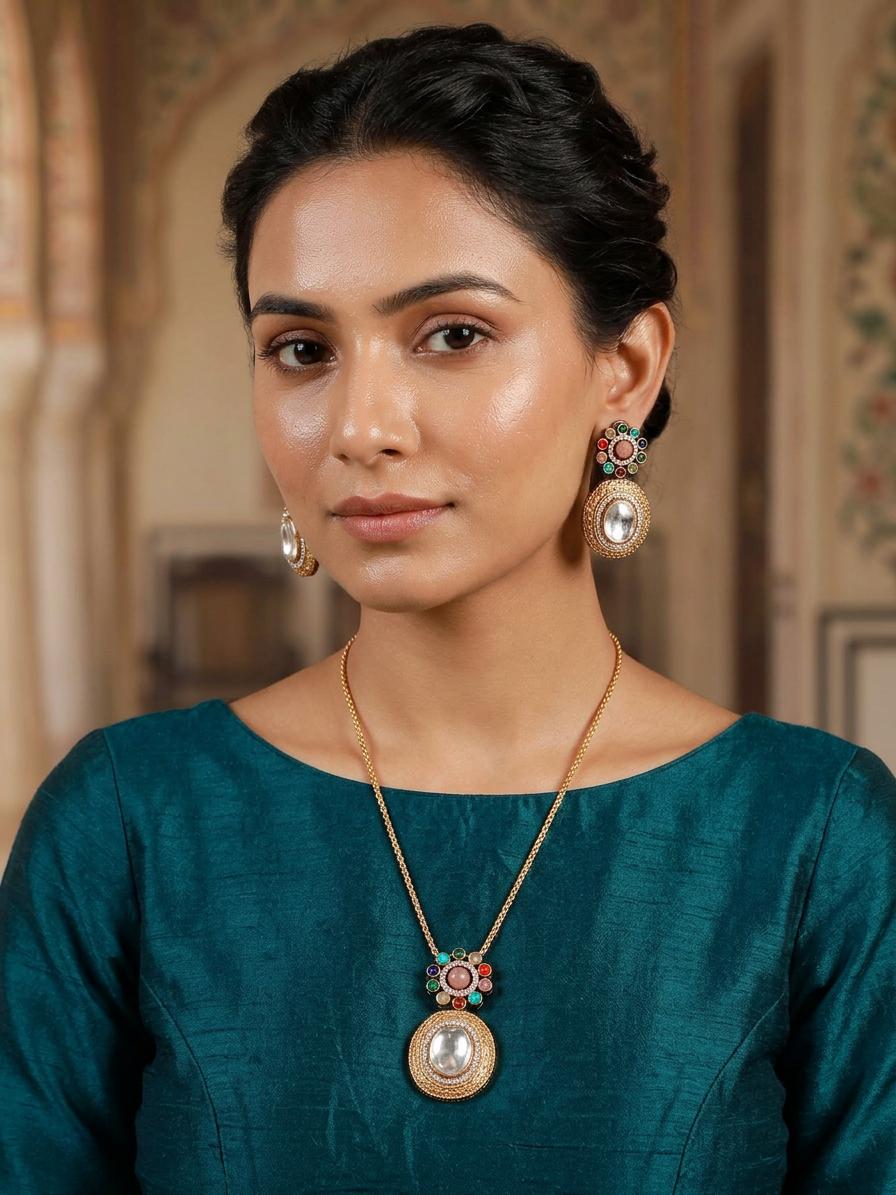 Whether you're attending a wedding, a gala, or a special evening out, this multicolor Kundan stone pendant set will add a touch of regal sophistication to your ensemble. Its versatile design complements a variety of outfits and styles, making it a valuable addition to any jewelry box. It's the perfect gift for yourself or a loved one who appreciates fine craftsmanship and timeless beauty. Let this breathtaking piece become a cherished heirloom, passed down through generations as a symbol of elegance and enduring style.