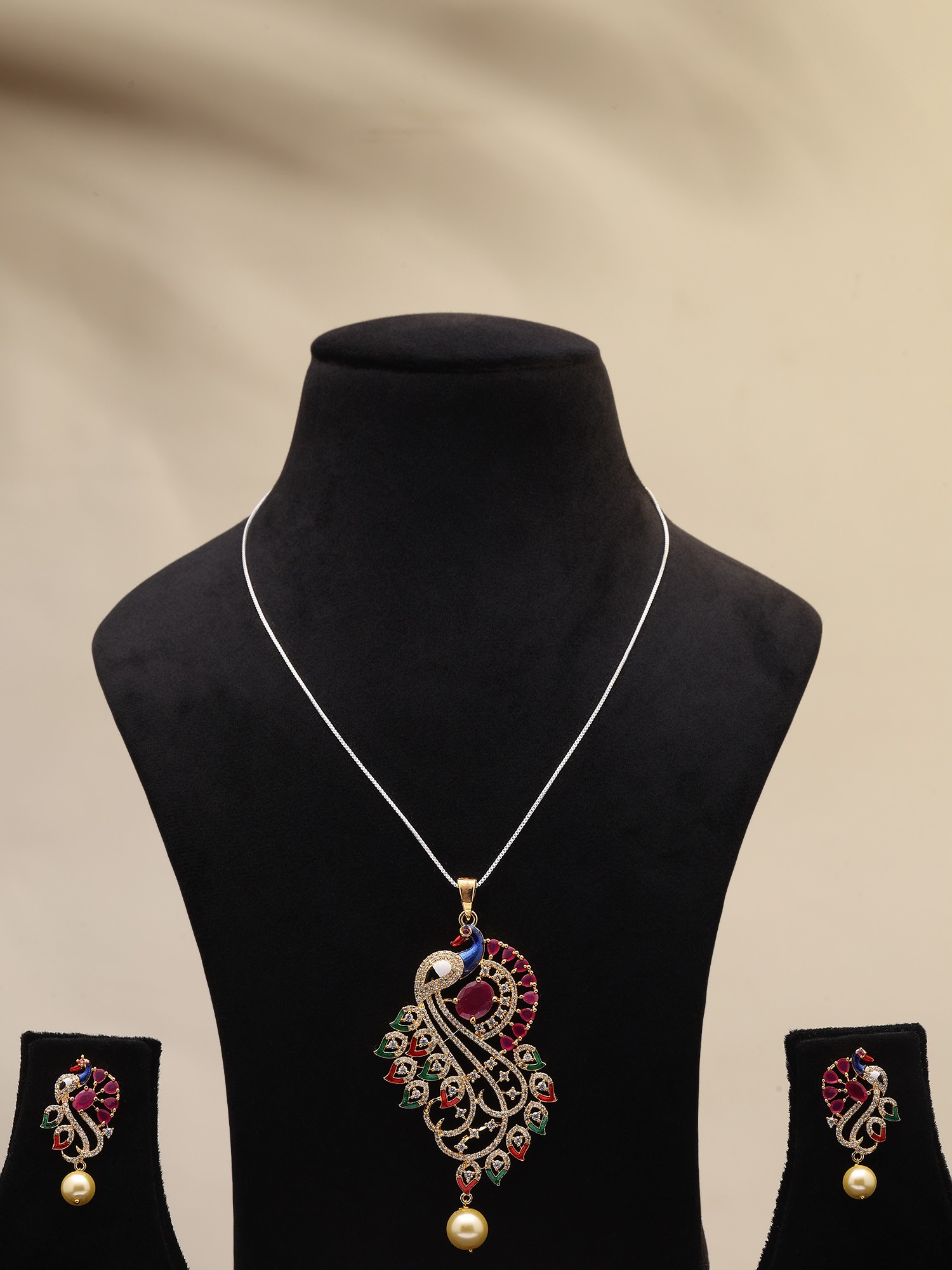 Designer Peacock Pendant and Earrings Set with Cubic Zirconia