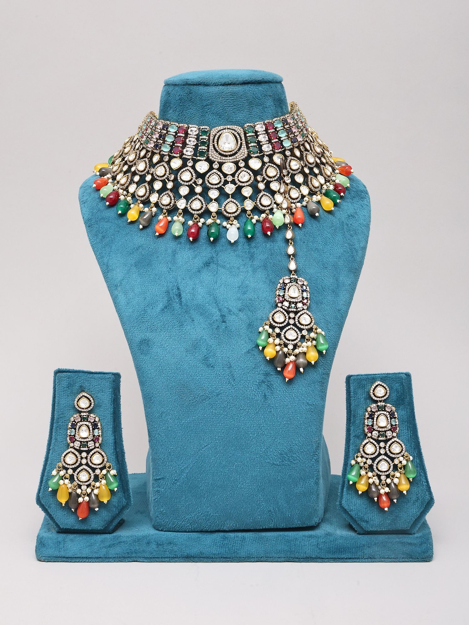 Multicolor Polki Bridal Choker Necklace Set with Maang Tikka and Bead Drops