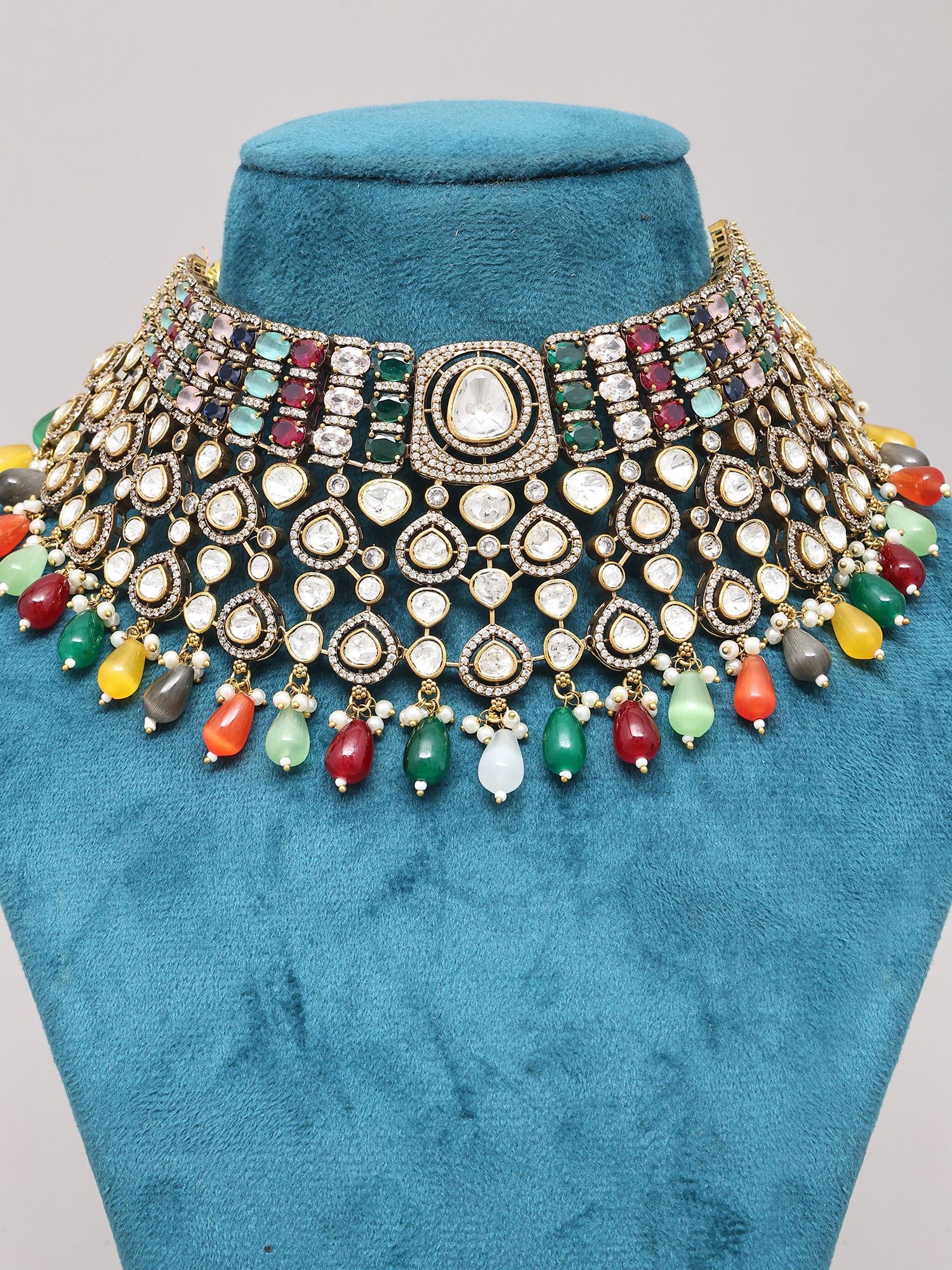 Features a striking multicolor Polki choker necklace designed for bridal elegance.