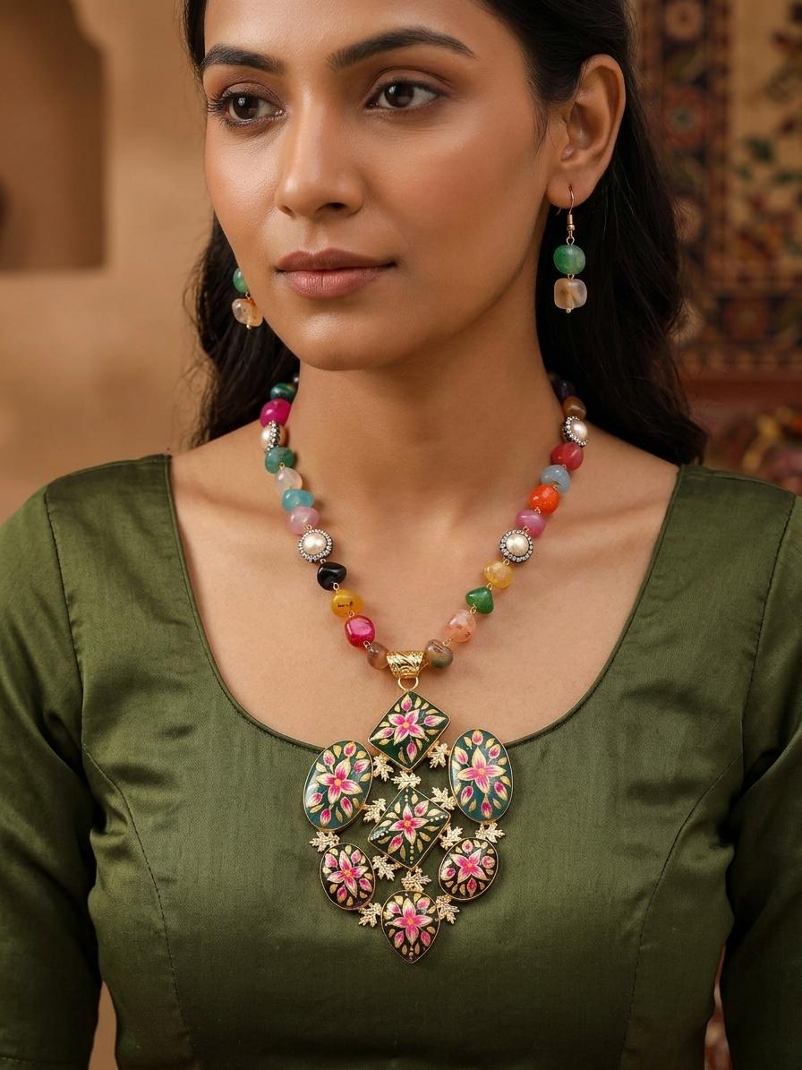 Multicolor Stone Beaded Necklace Set with Floral Enamel Pendant and Earrings
