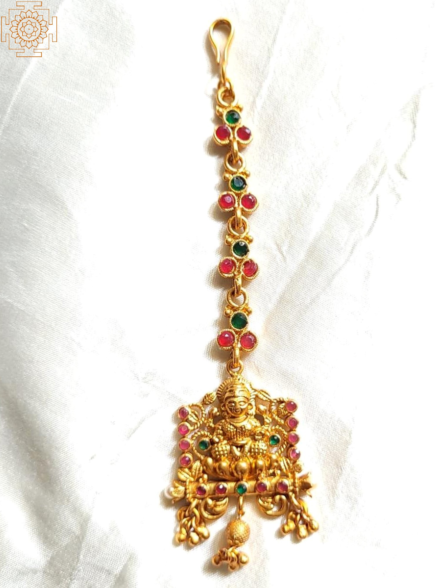 This Maang Tikka is meticulously handcrafted using traditional techniques passed down through generations. The high-quality brass ensures durability and longevity, ensuring this piece will remain a cherished heirloom for years to come. The careful setting of the red and green stones prevents chipping or loss, maintaining the piece's impeccable appearance. Each element, from the delicate chain to the ornate Goddess Lakshmi pendant, is carefully crafted to create a truly exceptional piece of jewelry. The attention to detail reflects the dedication of the artisans who poured their heart and soul into creating this beautiful piece.