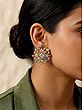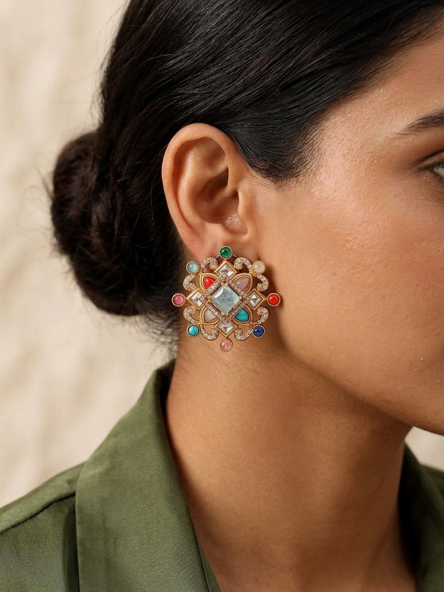 These aren't just earrings; they're miniature works of art. Each earring is a captivating mosaic of vibrant gemstones, meticulously arranged in a dazzling, geometric design. The rich hues of turquoise, emerald, ruby, and sapphire are complemented by the soft glow of moonstone and the sparkle of clear cubic zirconia, creating a truly unforgettable look. The intricate gold filigree setting adds a touch of elegance and sophistication, enhancing the overall splendor of these statement pieces. Perfect for adding a touch of luxury to any outfit, these earrings will elevate your style to new heights.
