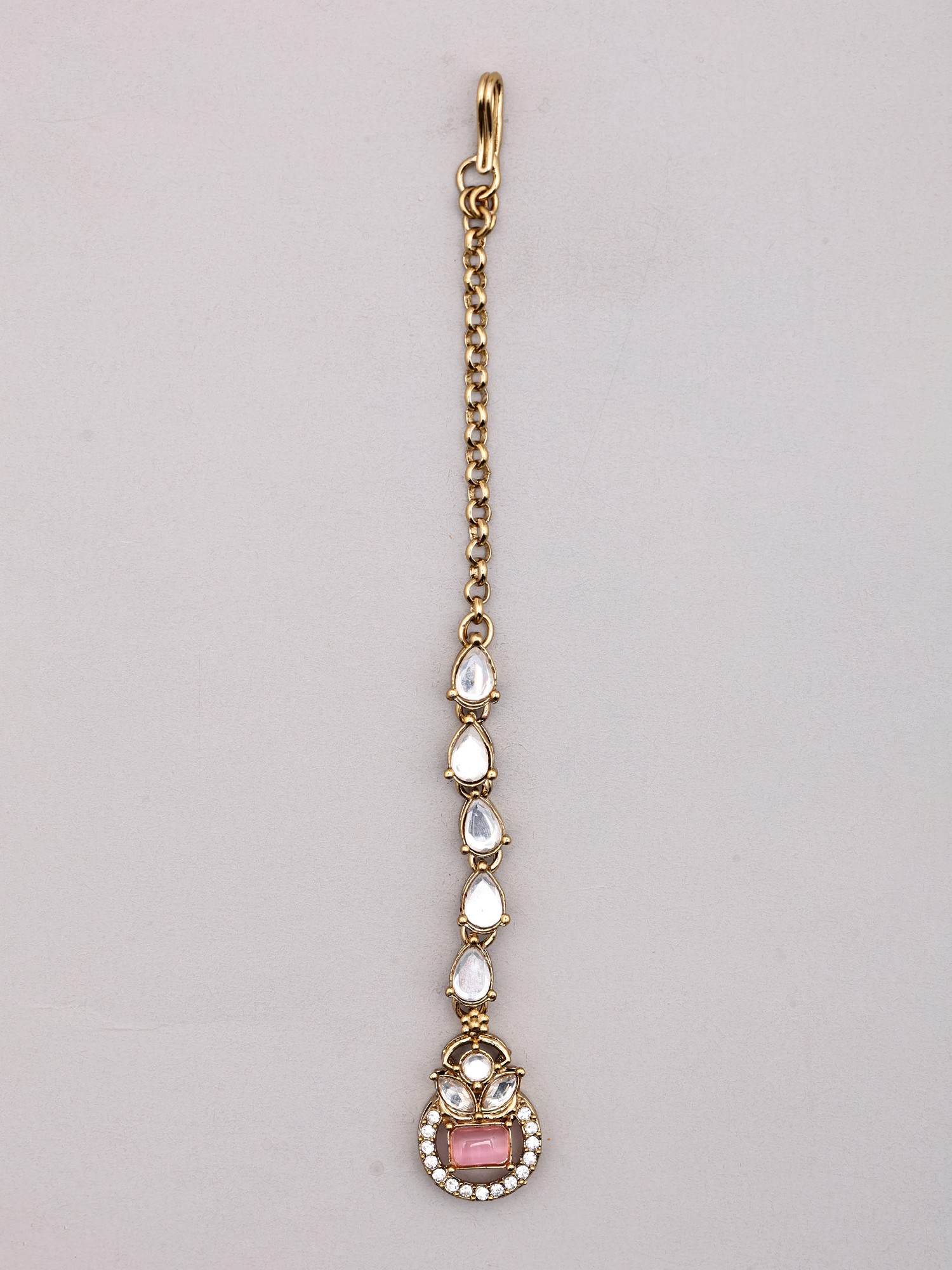 Stone Studded Pearl Drop Necklace Set with Earrings and Mangtika