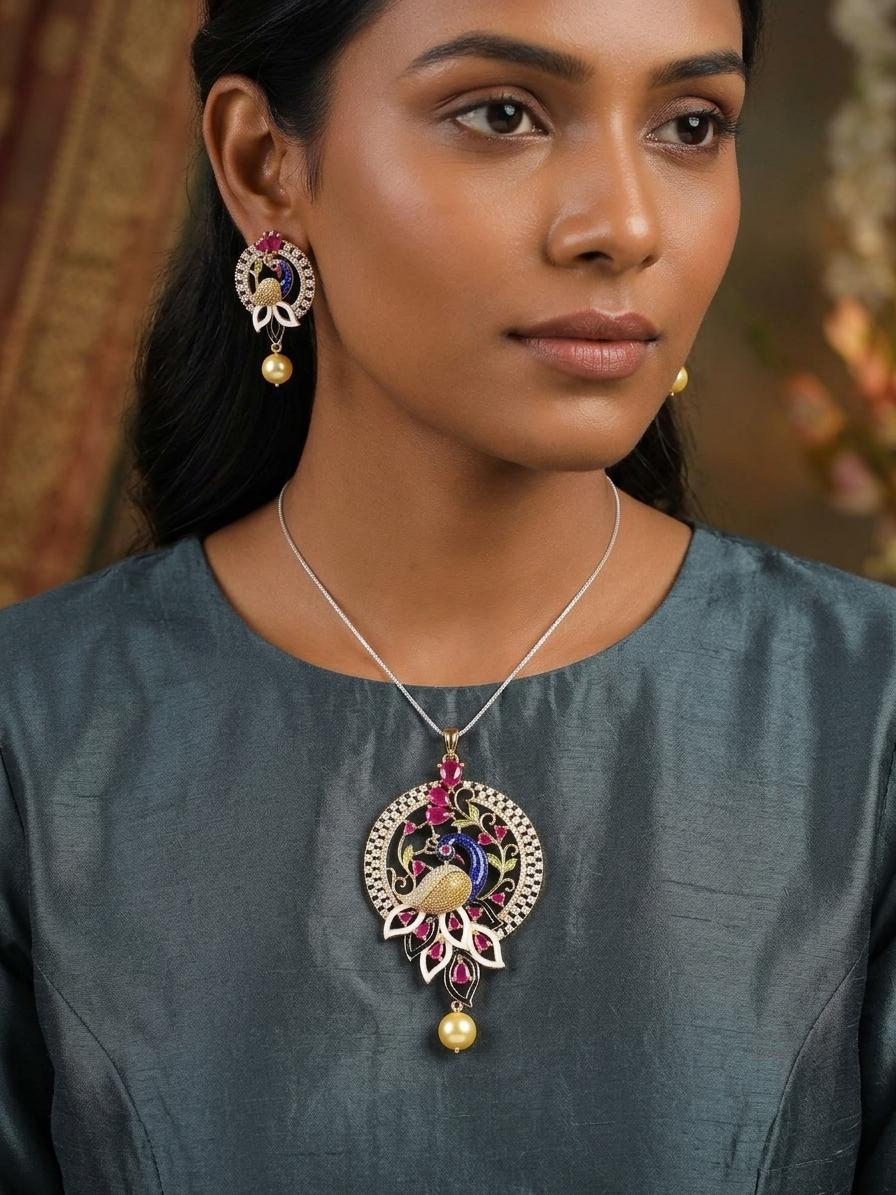 Stone Studded Peacock Design American Diamond Necklace Set With Earrings